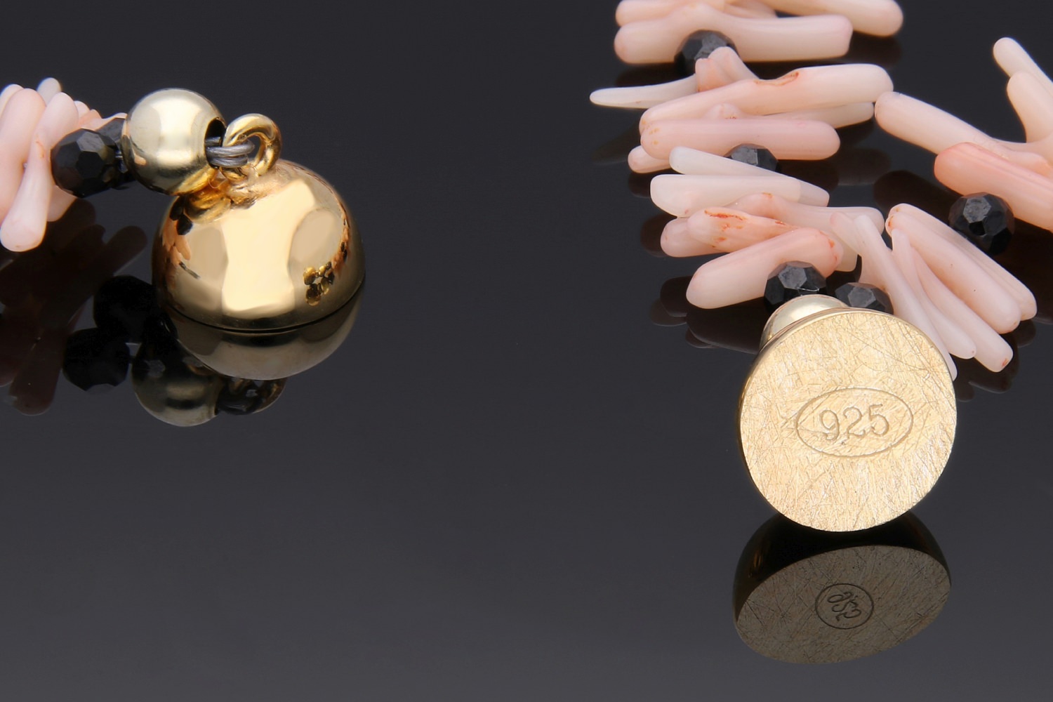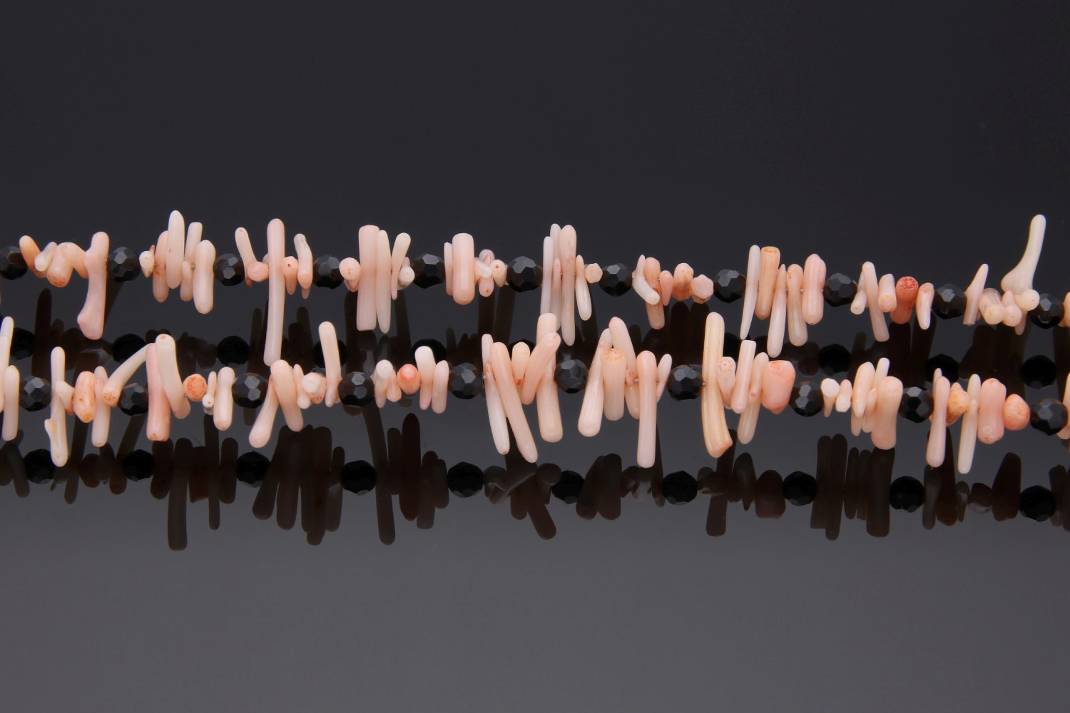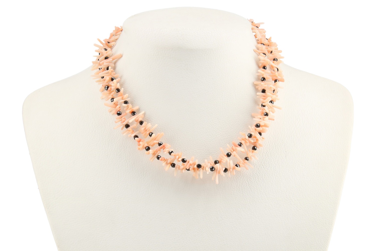 2-reihiges Collier mit rosa Korallenästen. Alle 5 Korallenäste ist eine 3mm große, facettierte, schwarze Spinellkugel gereiht. Dieses individuelle Schmuckstück ist auf Edelstahl gefädelt und besitzt einen kugelförmigen Magnetverschluß aus vergoldetem Sterlingsilber. Ein leichtes, feminines Collier aus unserer Werkstatt.