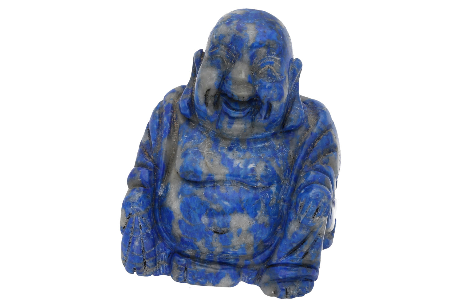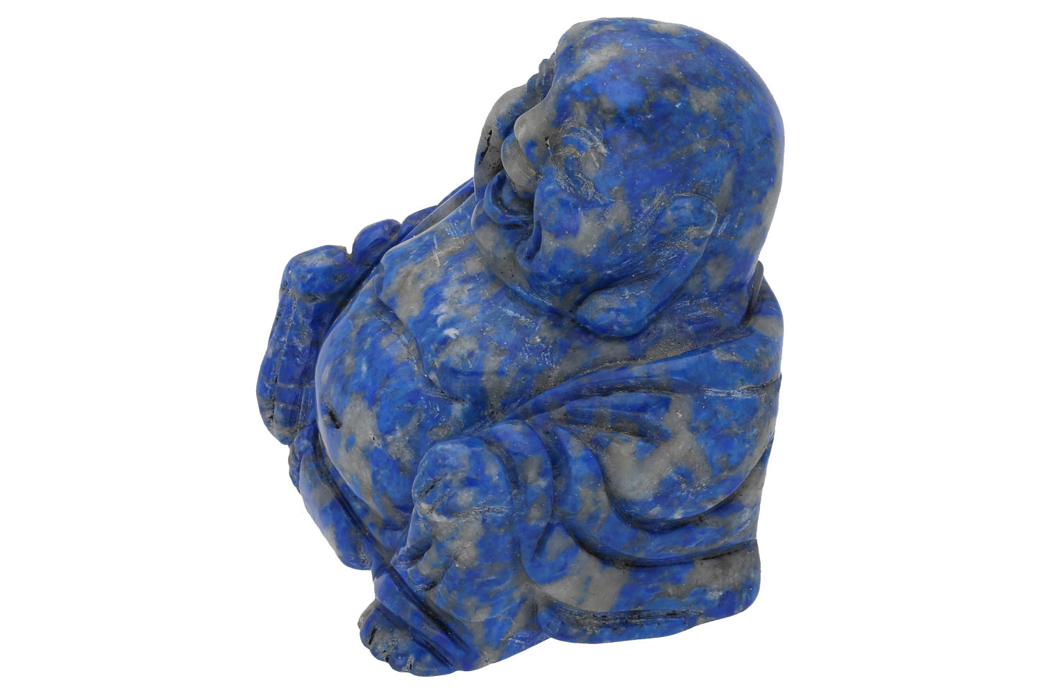 Gravur des lachenden Budhas aus Lapislazuli. Der blaugrau gemaserte Edelstein kommt aus Afganisthan. Ein feines Kleinod der symbolhaften Glücksfigur.