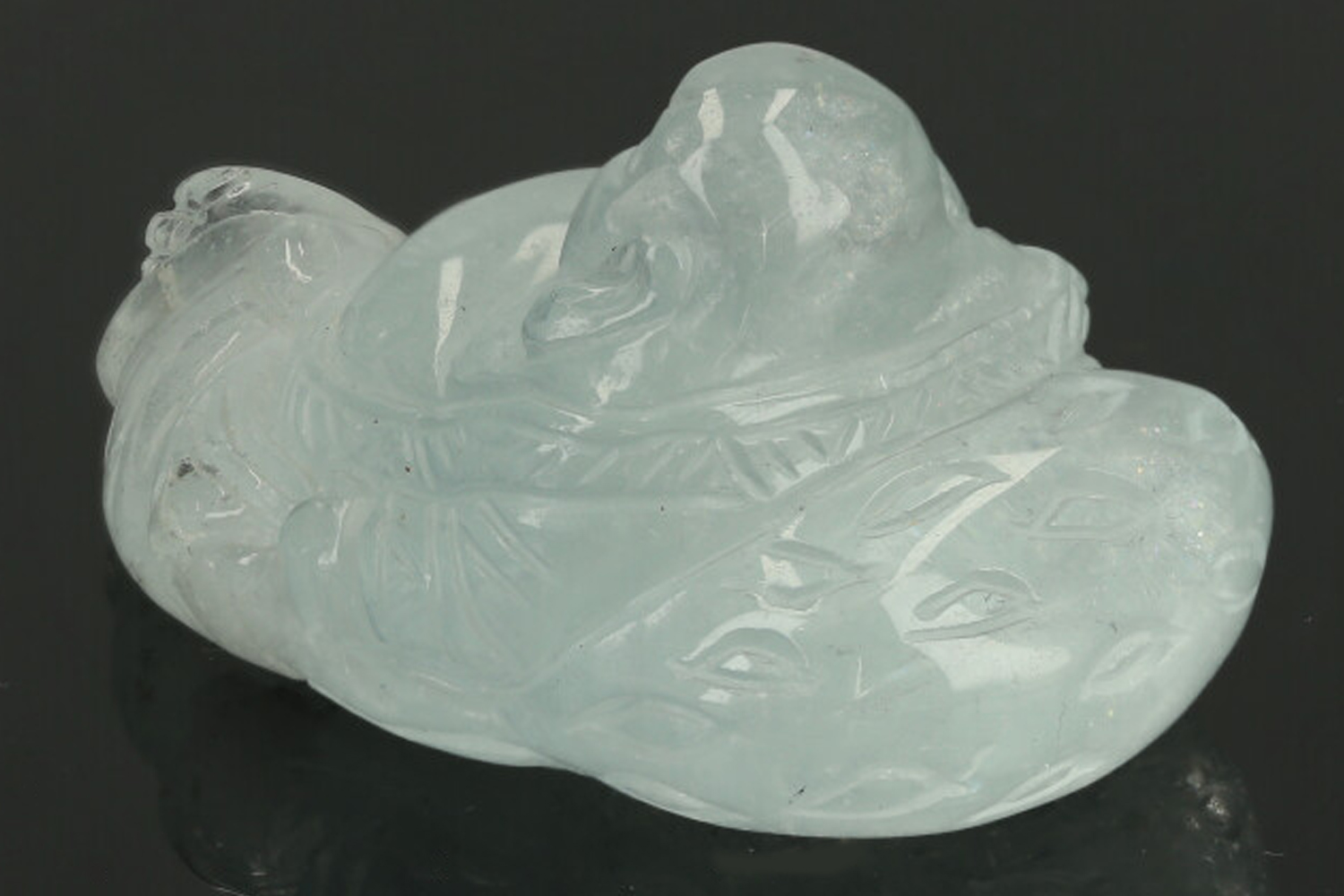 Gravur des lachenden Buddhas (Happy Buddha) aus transparentem Aquamarin. Aquamarin Gravuren sind sehr selten und dieses kleine Meisterwerk ist beeindruckend. Der Happy Buddha kommt aus dem chinesischen (Budai) und wird im japanischen Buddhismus (Hotei) genannt. Seine üppige Figur symbolisiert Reichtum und Lebenslust. Diese Gravur ist sehr fein gearbeitet mit den charakteristischen Details wie langen Ohrläppchen, dem feisten Grinsen. In seiner entspannten Körperhaltung ist er halb liegend an sein Bündel gelehnt.