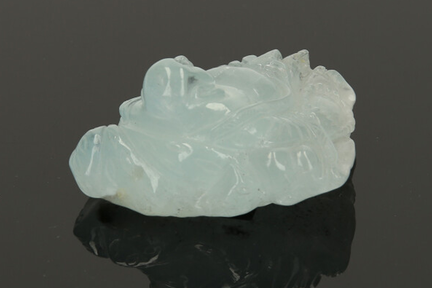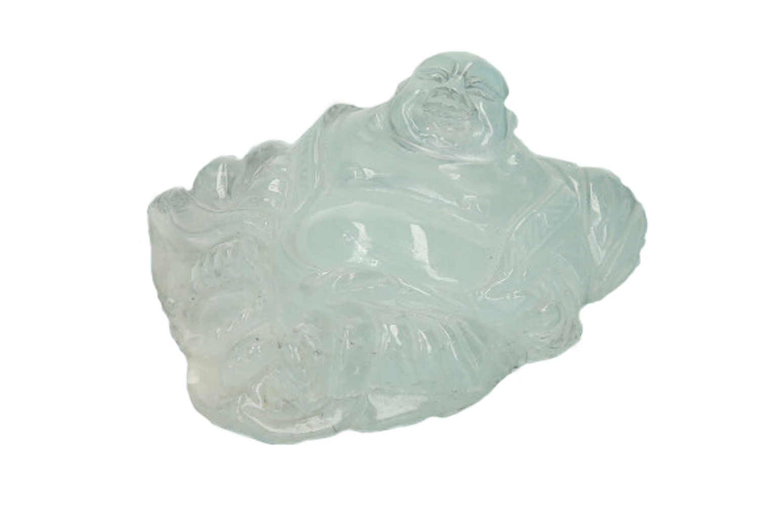 Originelle Gravur des lachenden Buddhas (Happy Buddha) aus transparentem Aquamarin. Aquamarin Gravuren sind sehr selten und dieses kleine Meisterwerk ist hervorragend. Der Happy Buddha kommt aus dem chinesischen (Budai) und wird im japanischen Buddhismus (Hotei) genannt. Seine üppige Figur symbolisiert Reichtum und Lebenslust. Diese Gravur ist sehr fein gearbeitet mit den charakteristischen Details wie langen Ohrläppchen, dem feisten Grinsen und der Mala in seiner Rechten. In seiner entspannten Körperhaltung ist er liegend an sein Bündel gelehnt.