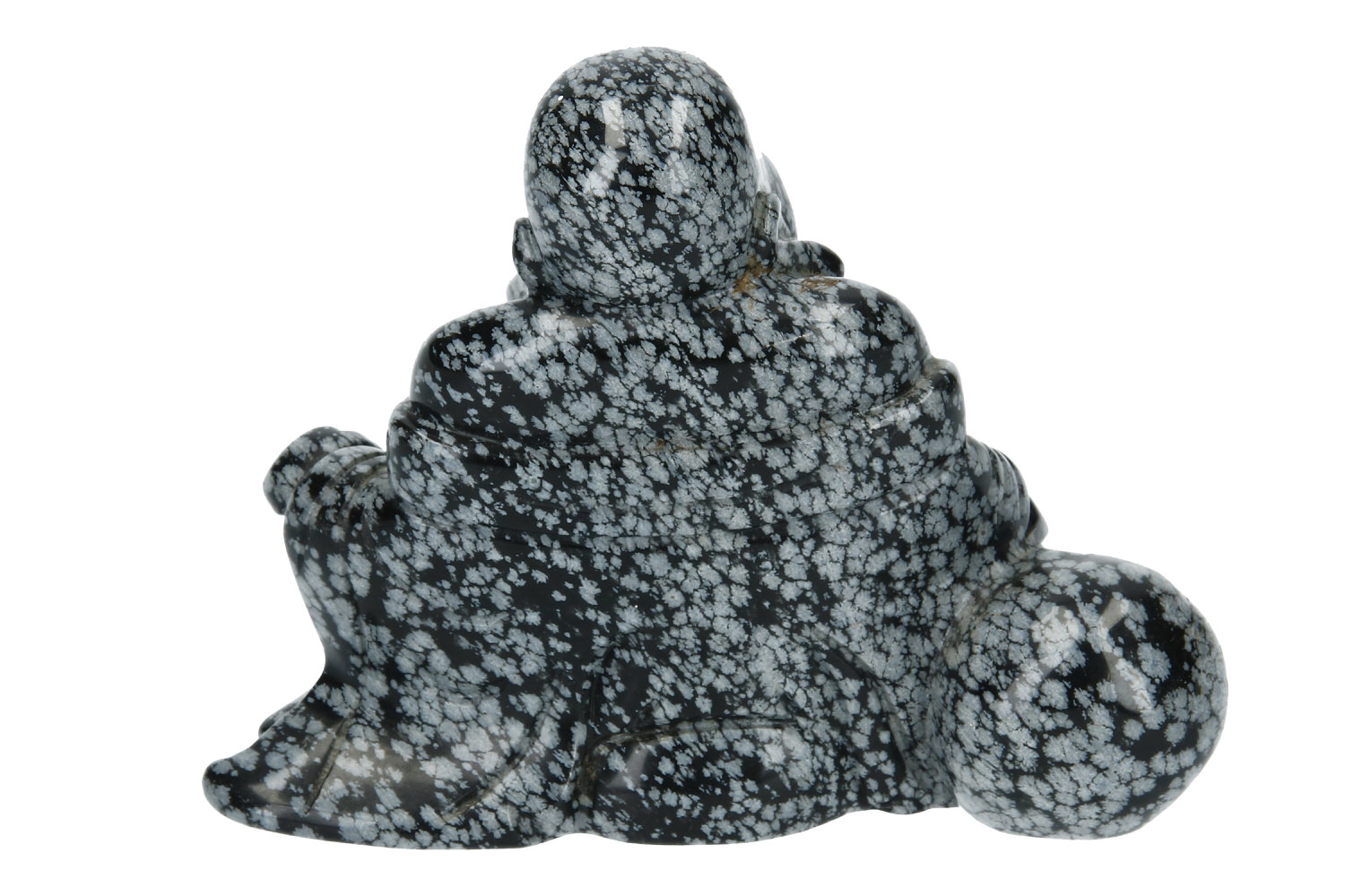 Sitzender Happy Buddha aus Schneefocken-Obsidian mit den typischen grau-weißen Fecken auf Schwarz. Seine Hände ruhen entspannt auf seinen Knien. Der Happy Buddha kommt aus dem chinesischen („Budai“) und wird im japanischen Buddhismus („Hotei“) genannt. Seine üppige Figur symbolisiert Reichtum und Lebenslust. Diese Gravur ist sehr fein gearbeitet mit den charakteristischen Details wie langen Ohrläppchen, dem feisten Grinsen und der entspannten Körperhaltung. Auch die typschen Attribute wie die Mala und sein Bündel fehlen nicht.