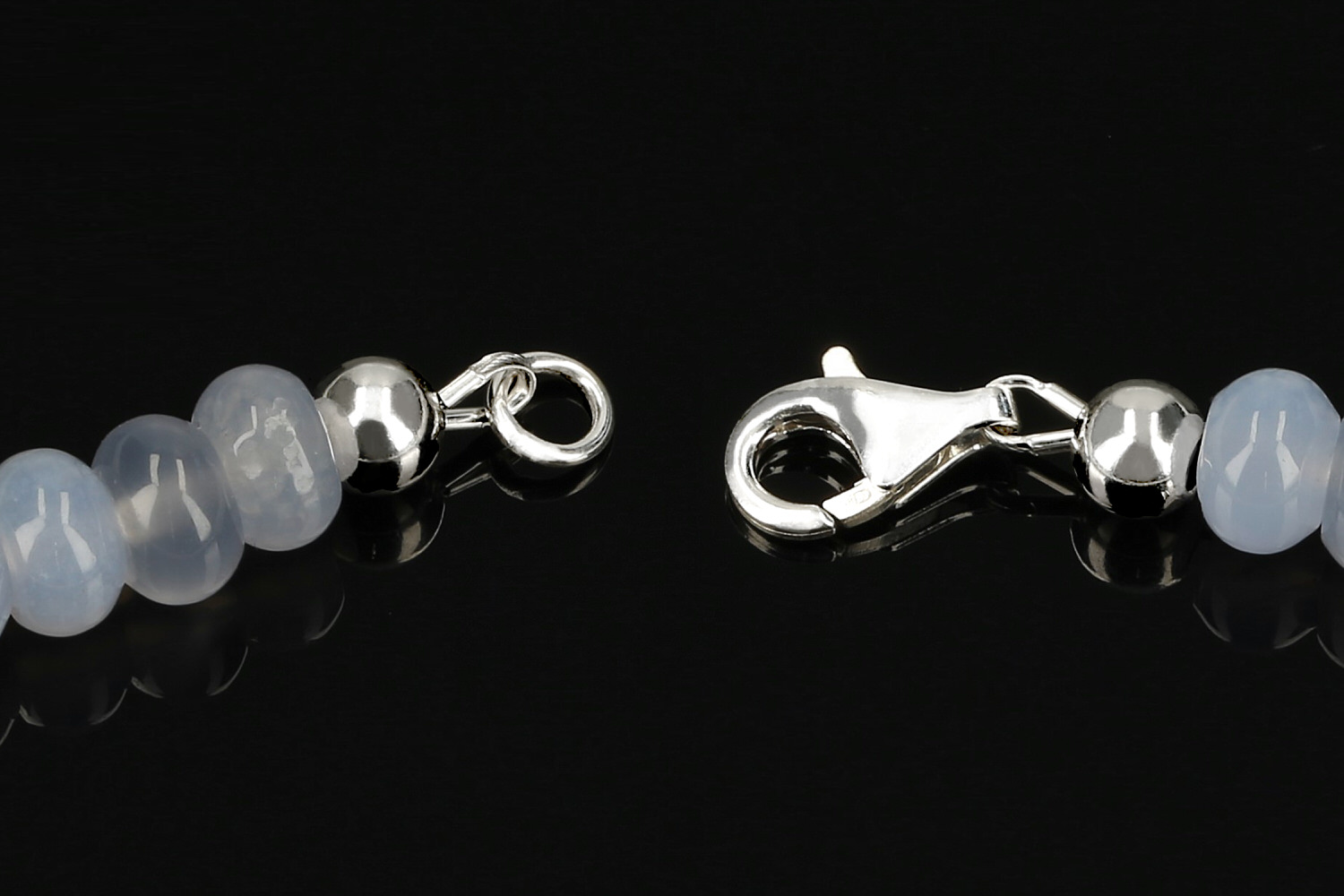 Armband mit 8mm Buttons aus blauem Chalcedon. Das Band aus unserer Werkstatt ist auf hochwertigen Edelstahldraht gefädelt, als Schließe haben wir einen klasssischen Karabiner gewählt. Karabiner und die 6mm-Kaschierkugeln sind aus poliertem Sterlingsilber gefertigt. Das Schmuckstück mit dem beliebten blauen Edelstein in Kombination mit den Silberteilen ist von feinster Eleganz.