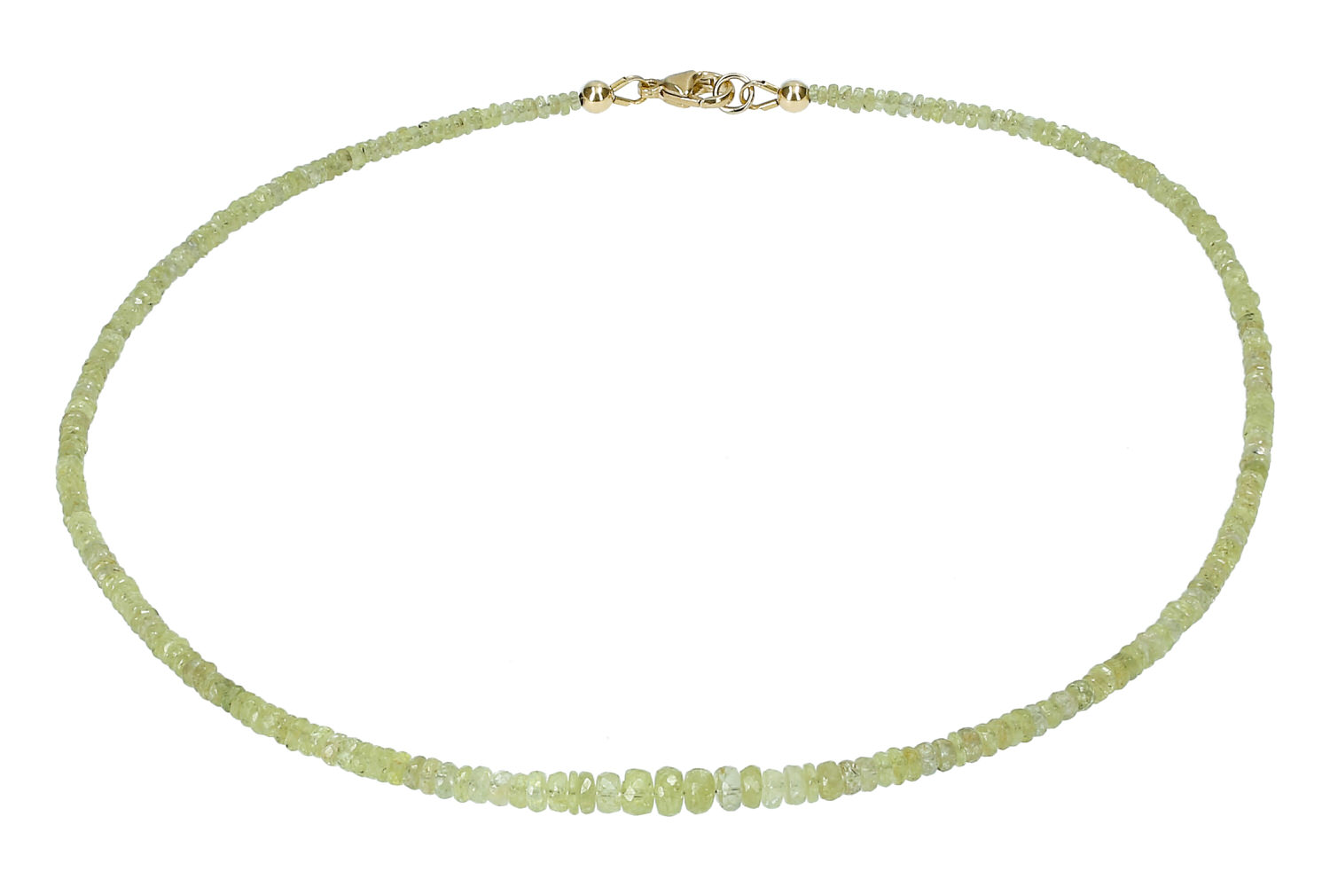 Chrysoberyll Kette mit facettierten Buttons aus Chrysoberyll-Katzenauge in 43cm Länge. Die transparenten Edelsteine zeigen den begehrten Katzenaugen-Effekt (Chatoyance) in leuchtend gelbgrüner Farbe. Die funkelnden Edelsteine haben einen Durchmesser 2,5 bis 5,5mm in der Mitte. Dieses exklusive Schmuckstück aus unserer Werkstatt ist auf hochwertigen Edelstahl gefädelt und mit Drahtschutz und Kaschierkugeln veredelt, Das eher ausgefallene und seltene Edelstein Collier besitzt einen Karabiner aus 14-karätigem (585/1000) Gelbgold. Eine absolut brillante Chrysoberyll-Katzenaugen Kette in einer leuchtenden, fast neongrünen Farbe. Ein Einzelstück!