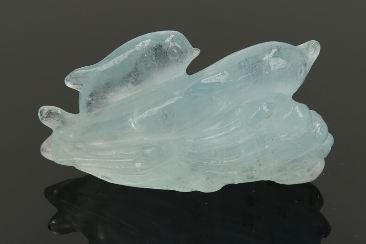 Gravur mit zwei Delphinen,welche auf einer Welle reiten. Eine sehr ansprechende Edelstein-Schnitzerei aus hellblauem Aquamarin. Das Kunstwerk ist sehr fein aus dem größtenteils transparenten Aquamarin gearbeitet. Ein absolutes Higlight, nicht nur für Liebhaber und Sammler dieses intelligenten Meerbewohners.