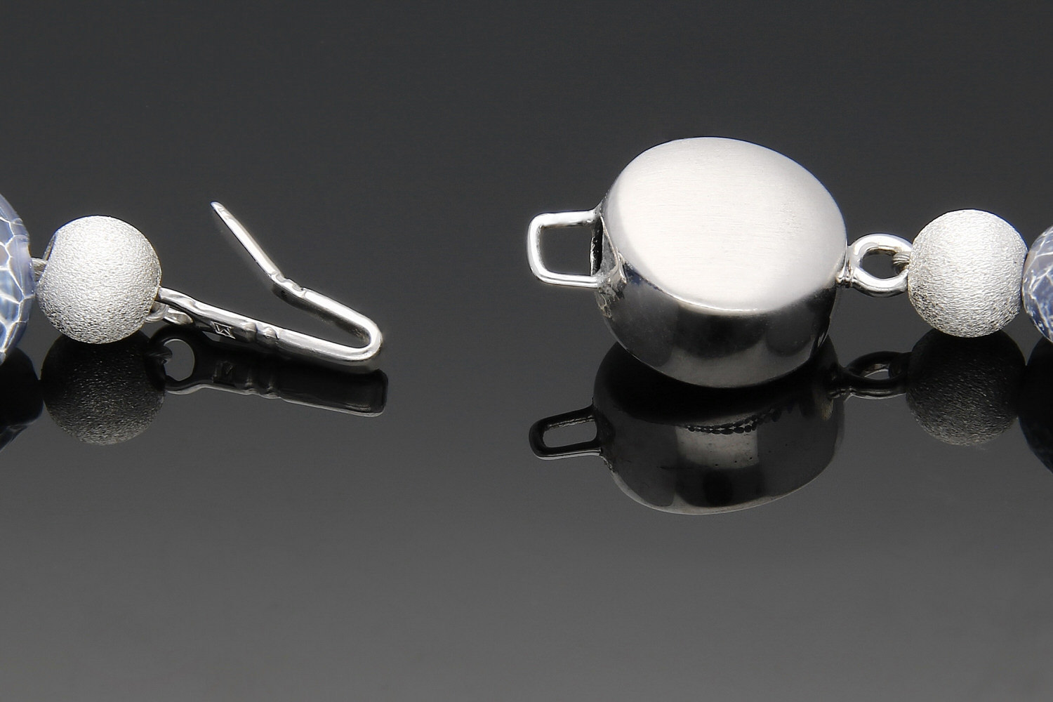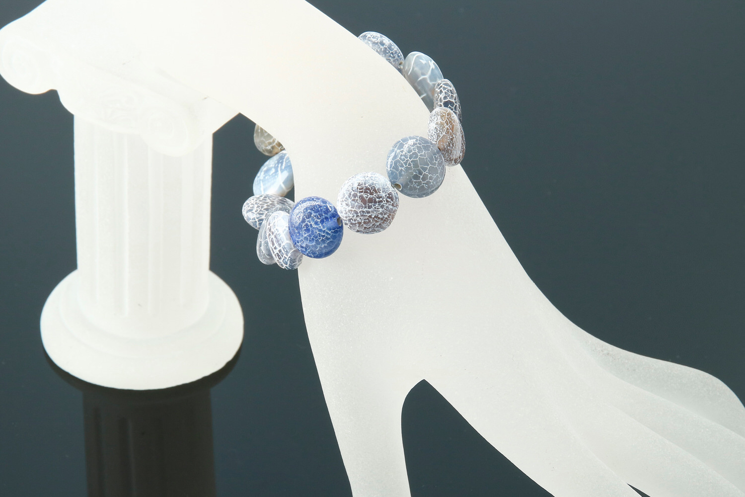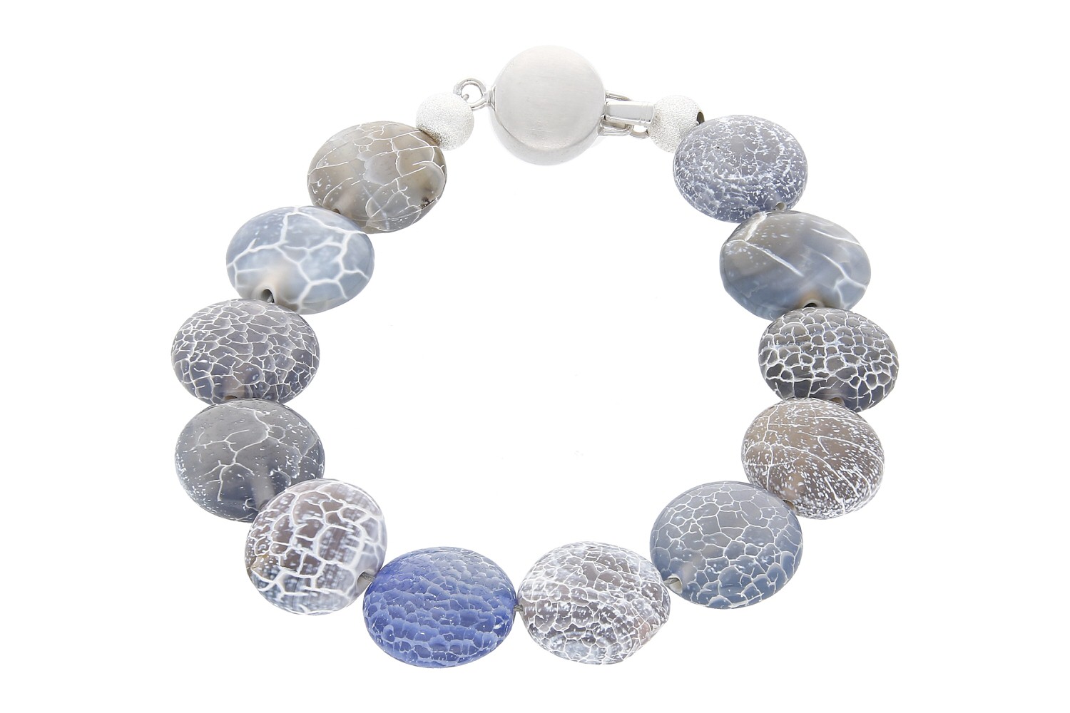 Armband mit längs gebohrten Disks aus blauem Weathering-Achat. Hierzu wird der blau gefärbte Achat erhitzt und kalt abgeschreckt, daher die Risse im Stein. Das trendige Armband ist auf stabilen Edelstahl gefädelt und besitzt eine passende flache runde Sicherheitsschließe, welche wie die beiden Abschlußkugeln gebürstet und rhodiniert ist. Ein in sehr dekoratives Schmuckstück, passend zum Business-Kostüm und zur Jeans.