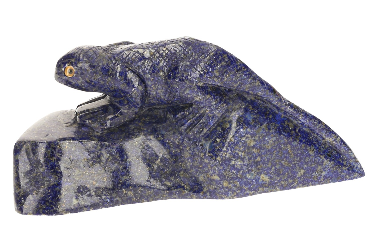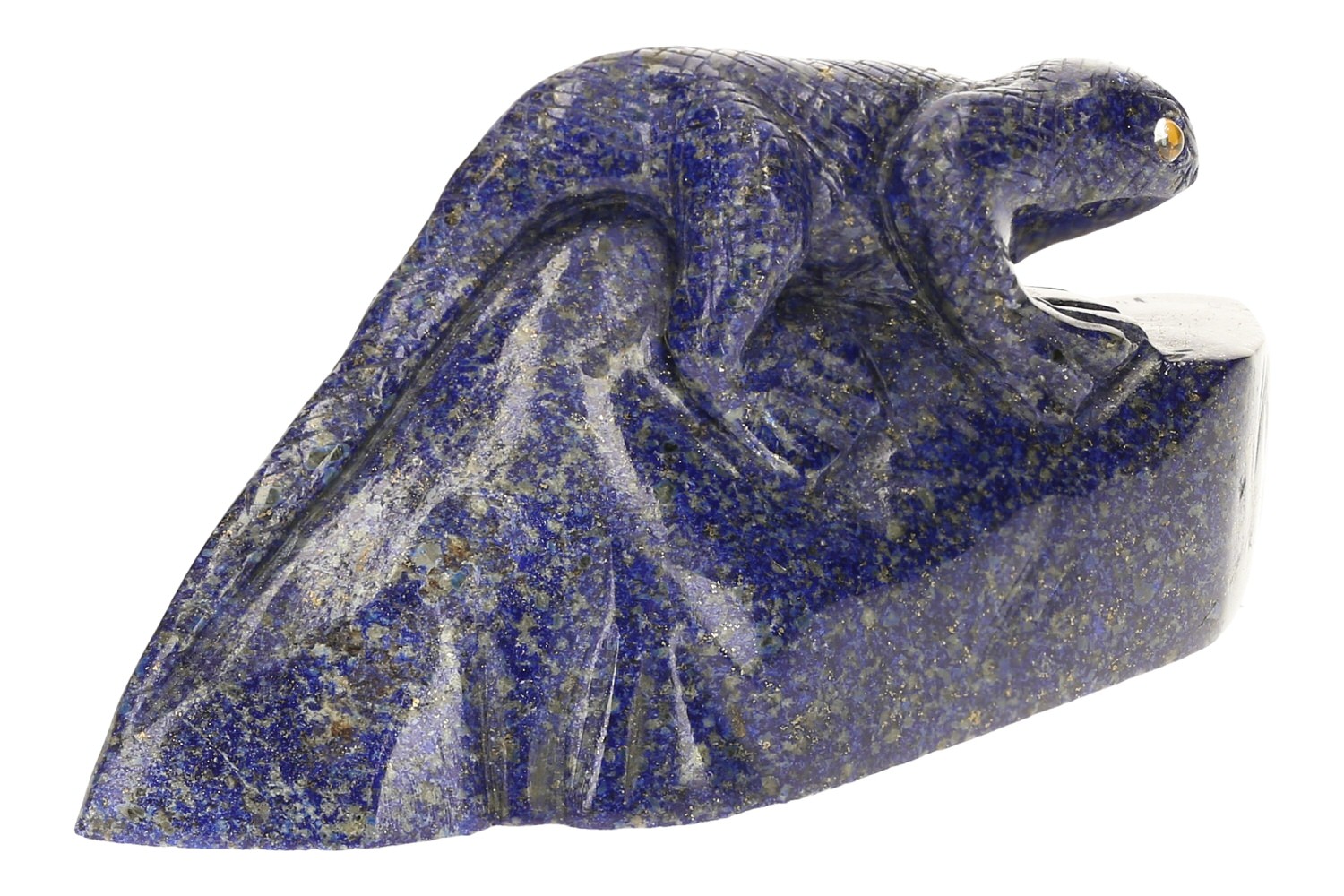 Echsen Gravur aus Lapislazuli. Diese großartige Edelstein Schnitzerei zeigt eine lauernde Echse, welche bereit zum Beutefang über einem Stein kauert. Sämtliche Details, sogar die Schuppen sind fein heraus gearbeitet. Der blaue Edelstein aus Afghanistan zeigt die typischen goldfarbenen Pyrit-Einlagerungen. Die gelben Glasaugen des Tieres sind in einem perfekten Kontrast zu dem Königsblau des Lapislazuli.