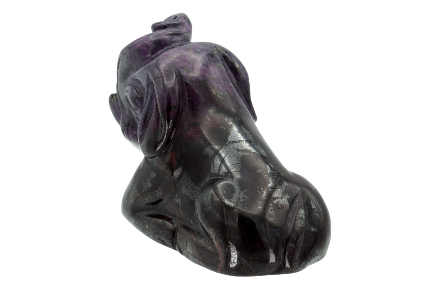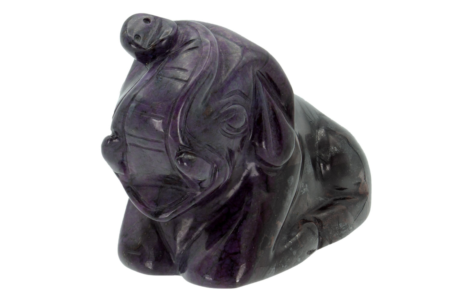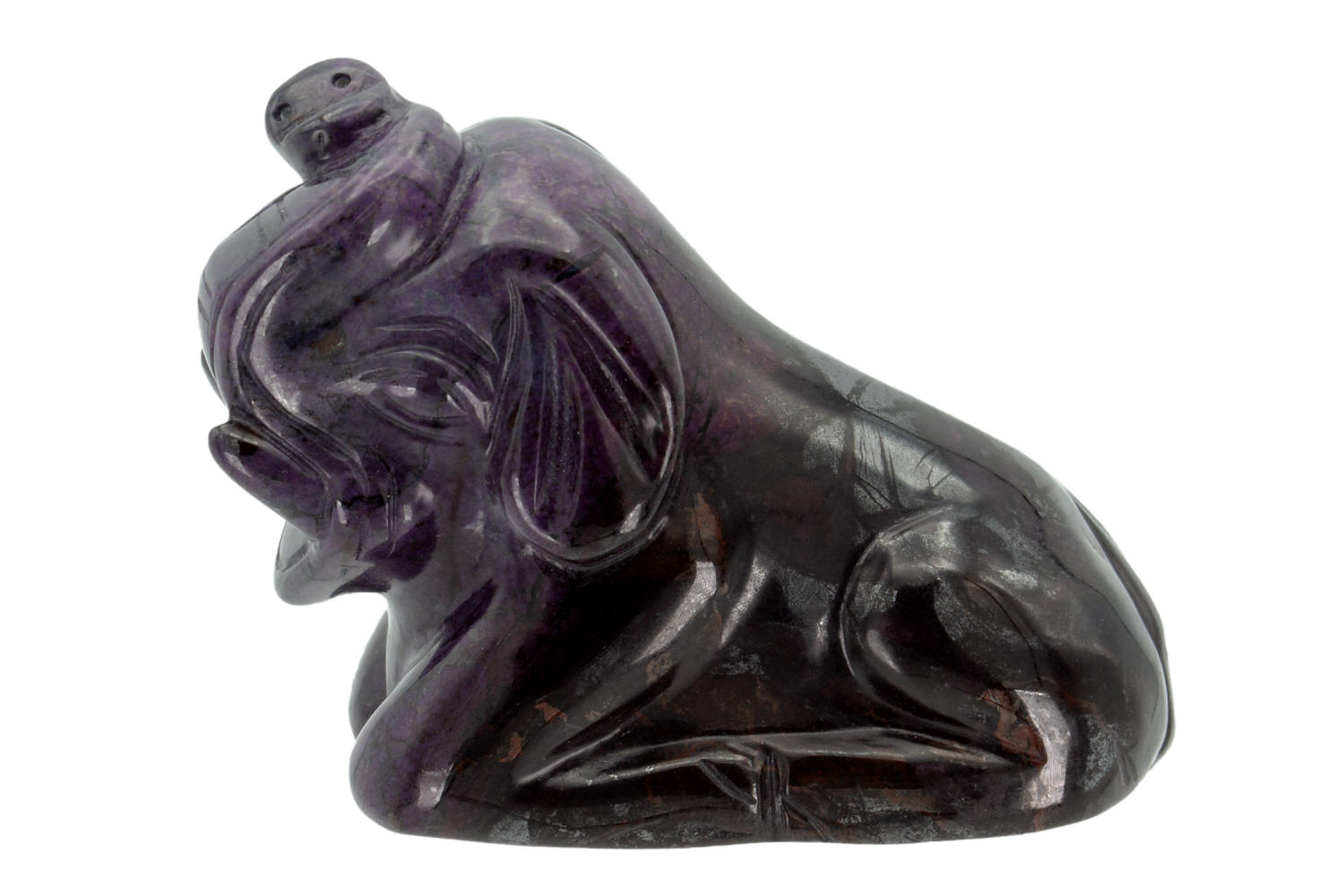 Gravur eines liegenden Elefanten aus lilafarbenem Sugilith. Der putzige Elefant ist aus dem seltenen und kostbaren Edelstein aus Südafrika geschnitzt. Das Maul geöffnet, den Rüssel nach oben erfüllen sie alle Voraussetzungen als Glücksbringer...