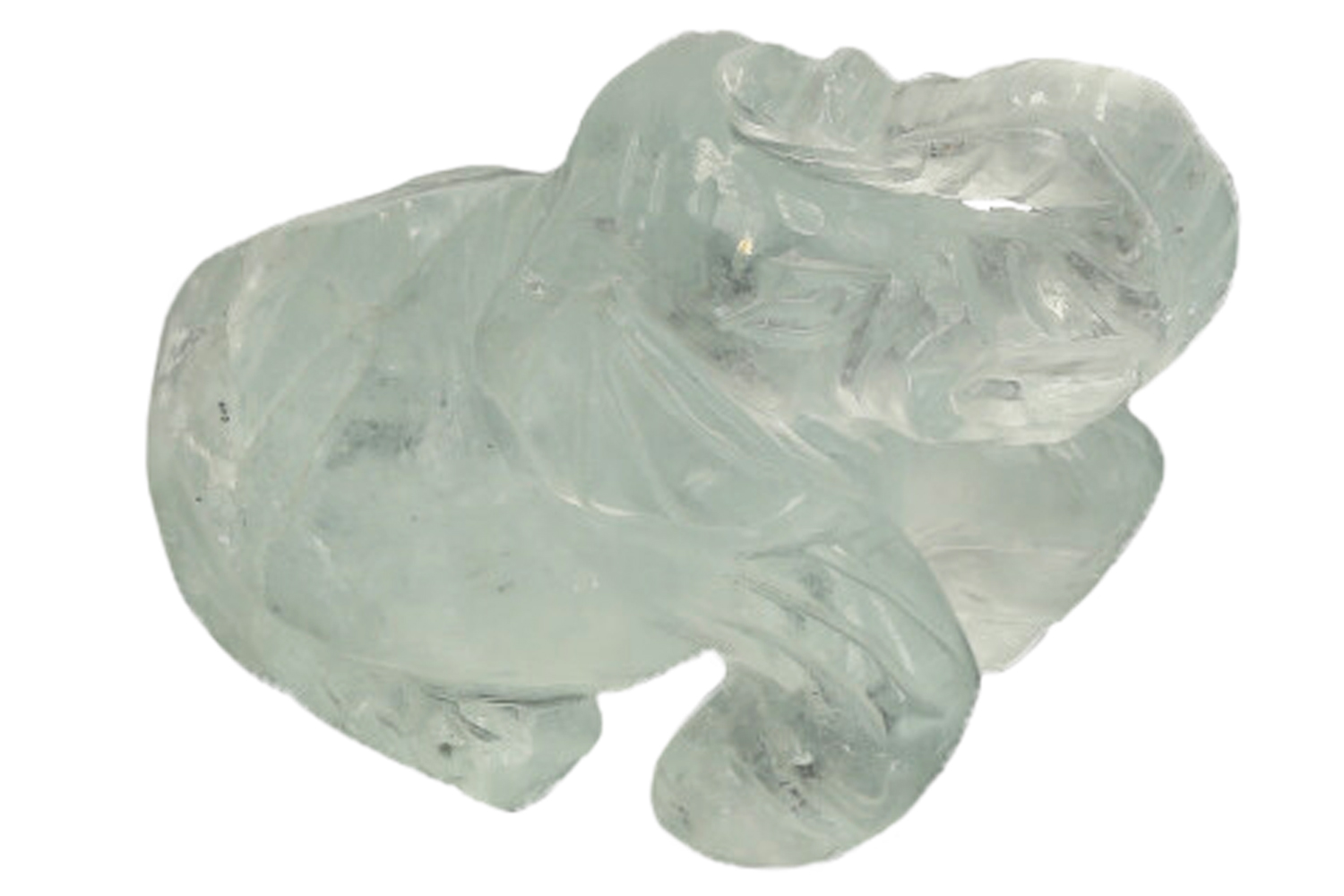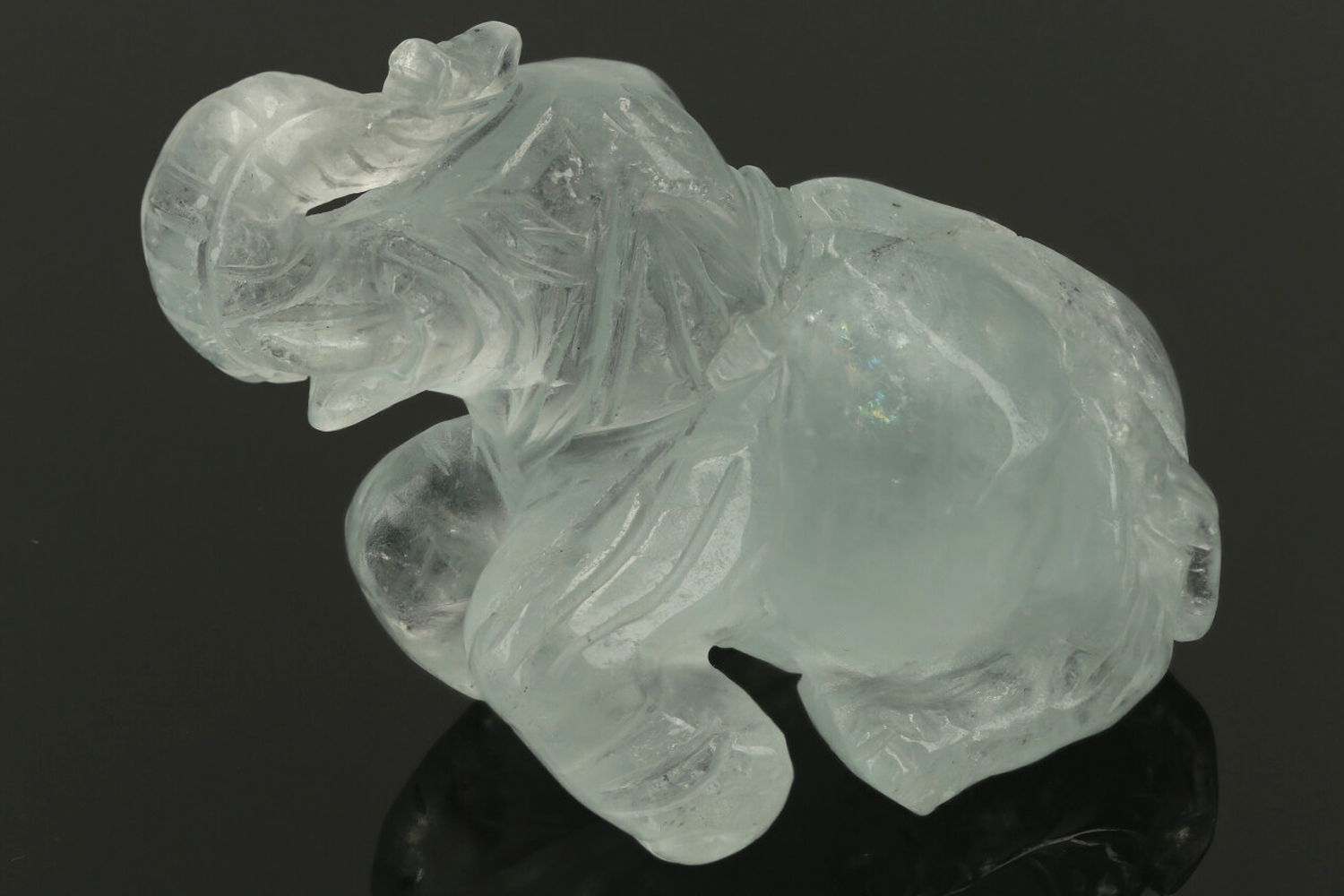 Detaillierte Darstellung eines gerade niederknienden Elefanten. Die meisterliche Edelsteinschnitzerei zeigt den Dickhäuter mit erhobenem Rüssel. Das Tier ist aus einem transparenten, hellblauen Aquamarin geschliffen. Ein großartiges Kunstwerk, nicht nur für Liebhaber und Sammler von Elefanten.