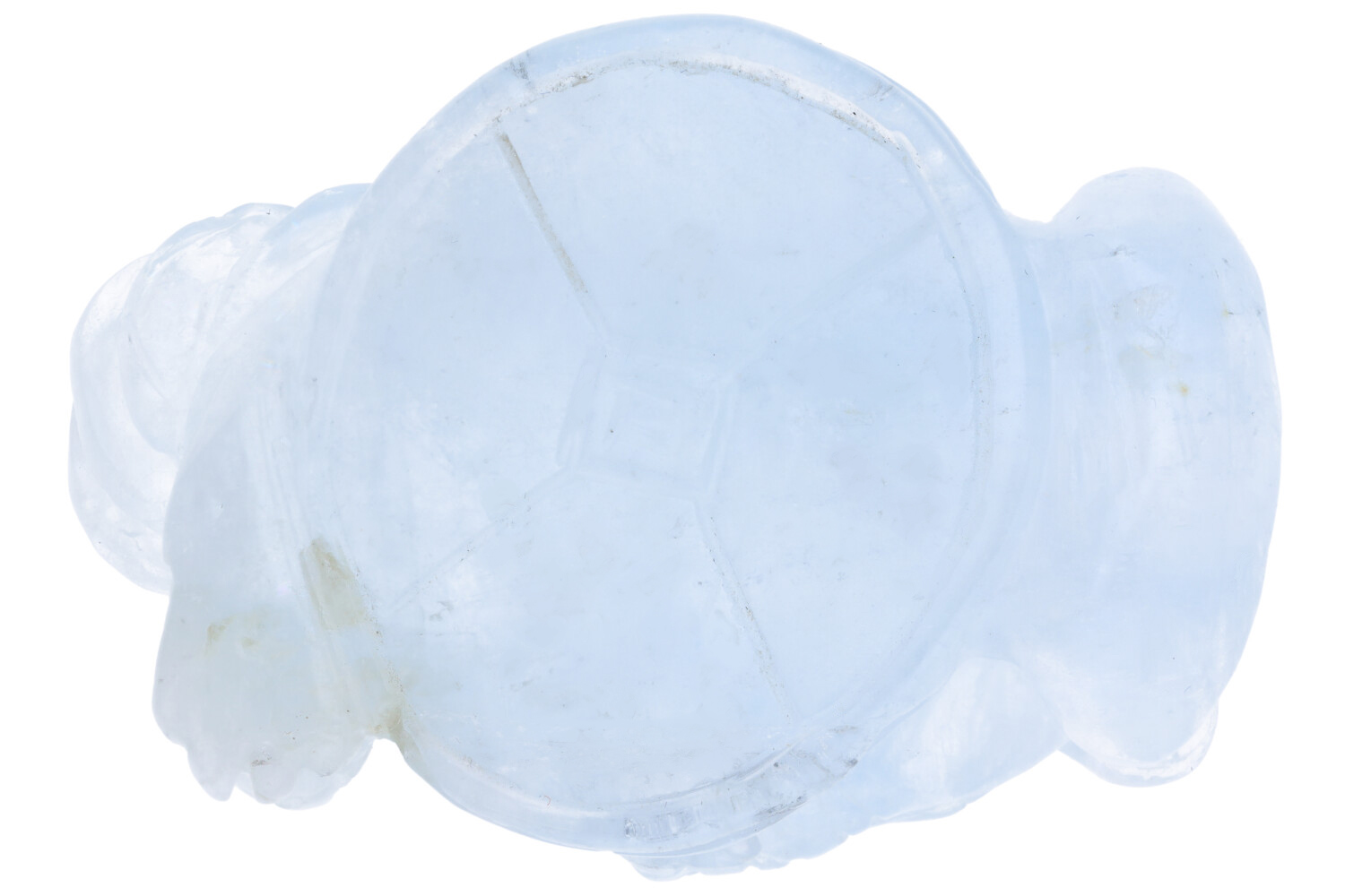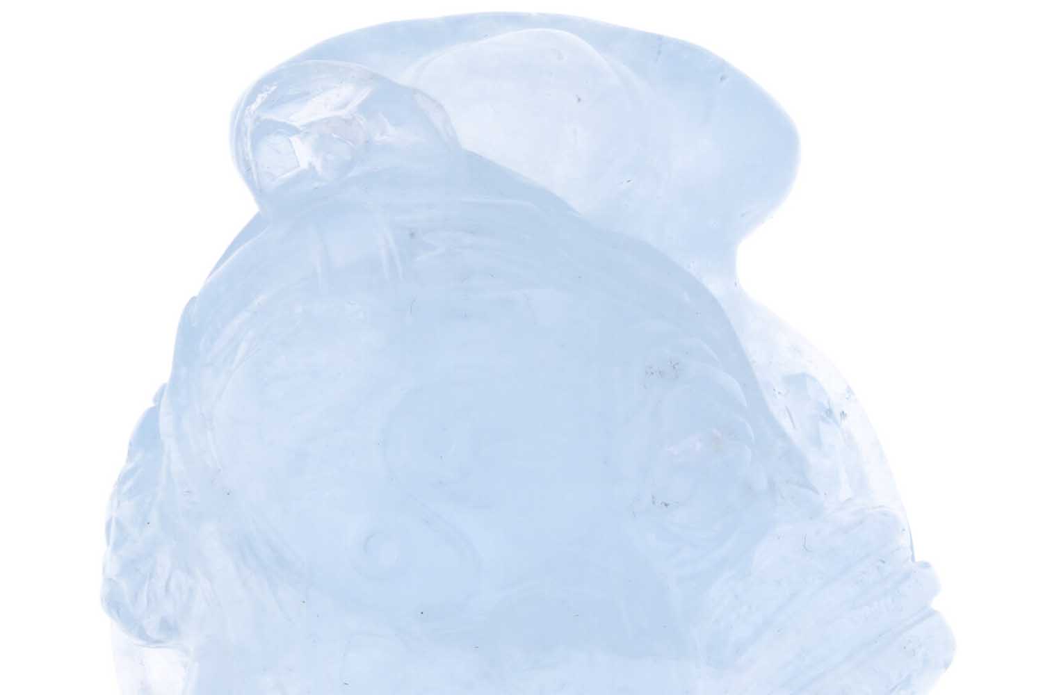 Liebevolle Gravur einer Feng Shui-Kröte aus Aquamarin. Die 3-beinige Kröte symbolisiert im chinesischen Buddismus Reichtum und Geldsegen und hat im Nacken eine Yin und Yang-Gravur. Dieser auch Money Frog oder Lucky Toad genannte Glücksbringer soll der Haustüre zugewandt aufgestelt werden um das Geld einzufangen und herunter zu schlucken. Dieses detailliert gravierte Exemplar sitzt auf einer Glücksmünze und hält eine weitere im Maul. Auch hinter seinem rechten Vorder- und seinem hinteren dritten Bein ist je ein Stapel mit drei Feng Shui-Münzen zu sehen. Vor seinem Kopf steht ein schalenförmiger Tael. Ein ganz besonderes Kunstwerk aus diesem begehrten hellblauen Edelstein. Einige kleine graugrüne Muskovit-Kristalle sind im Rücken der Kröte zu erkennen.