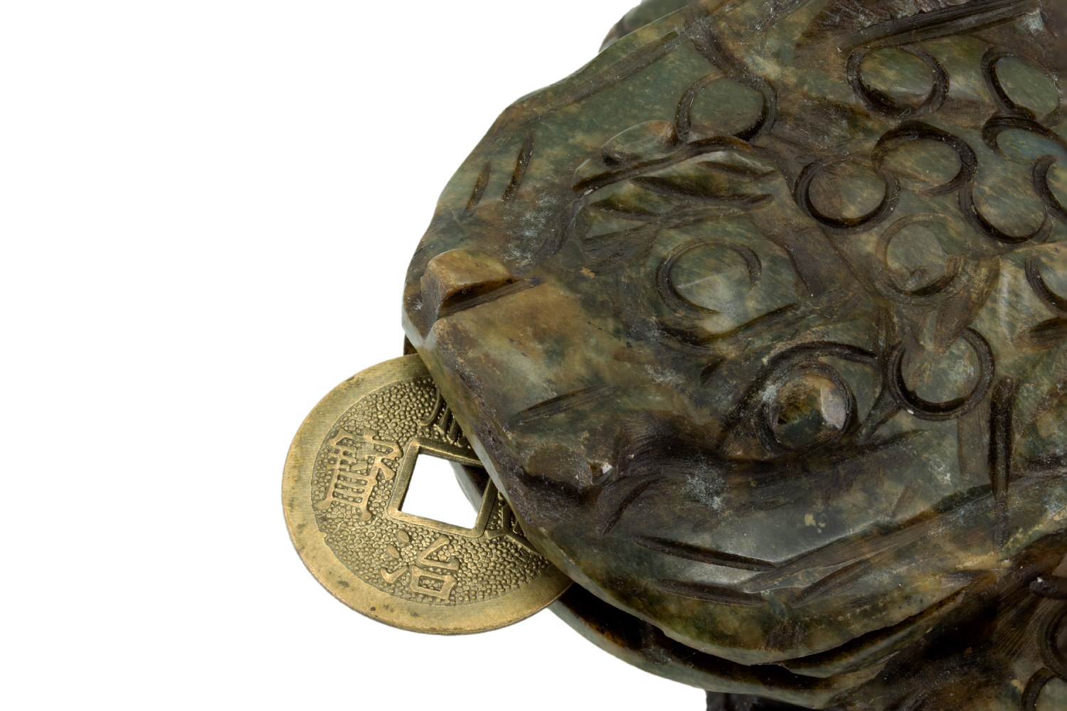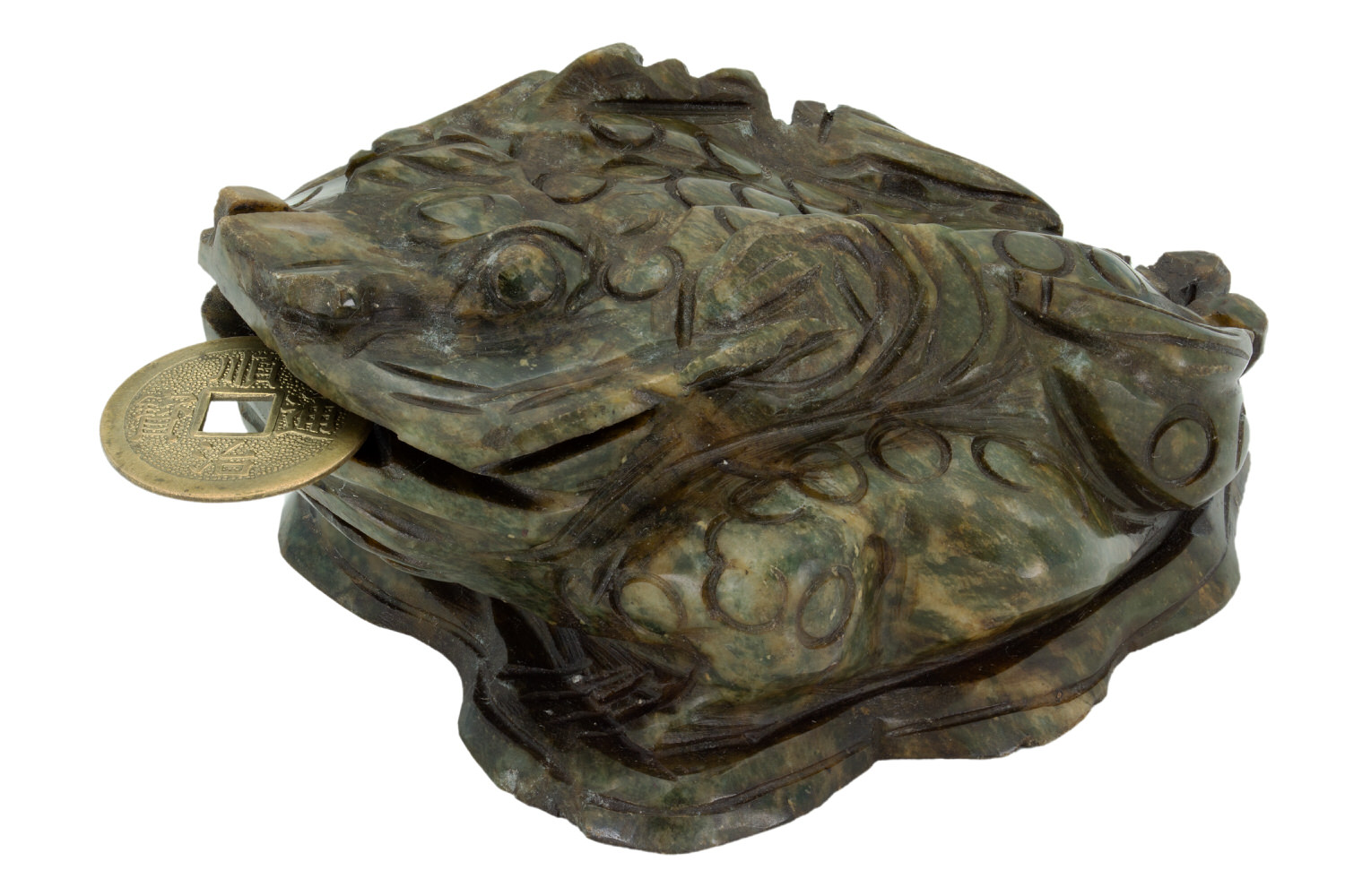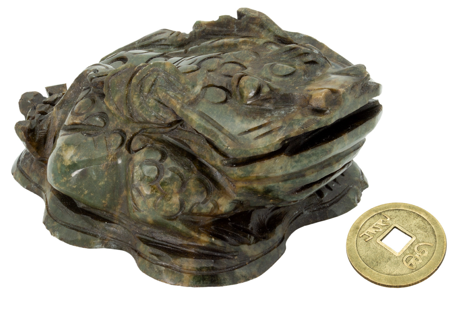 3-beinige Feng-Shui Kröte (engl.Lucky Toad) aus gebranntem Serpentin. Dieses chinesische Glückssymbol besitzt 3 Beine und hat eine Glücksmünze aus Messing im Maul, welche den Geldsegen bringt. Trotz ihrem etwas bedrohlichen Aussehen spielt sie im Feng-Shui eine wichtige Rolle. Eine detaillierte und meisterliche Stein-Gravur aus jadeähnlichem, grünbraunem Serpentin. Durch das Brennen wirkt dieser Glücksbringer patiniert.