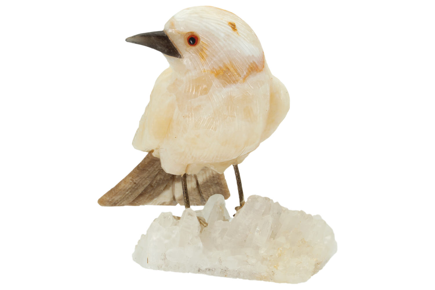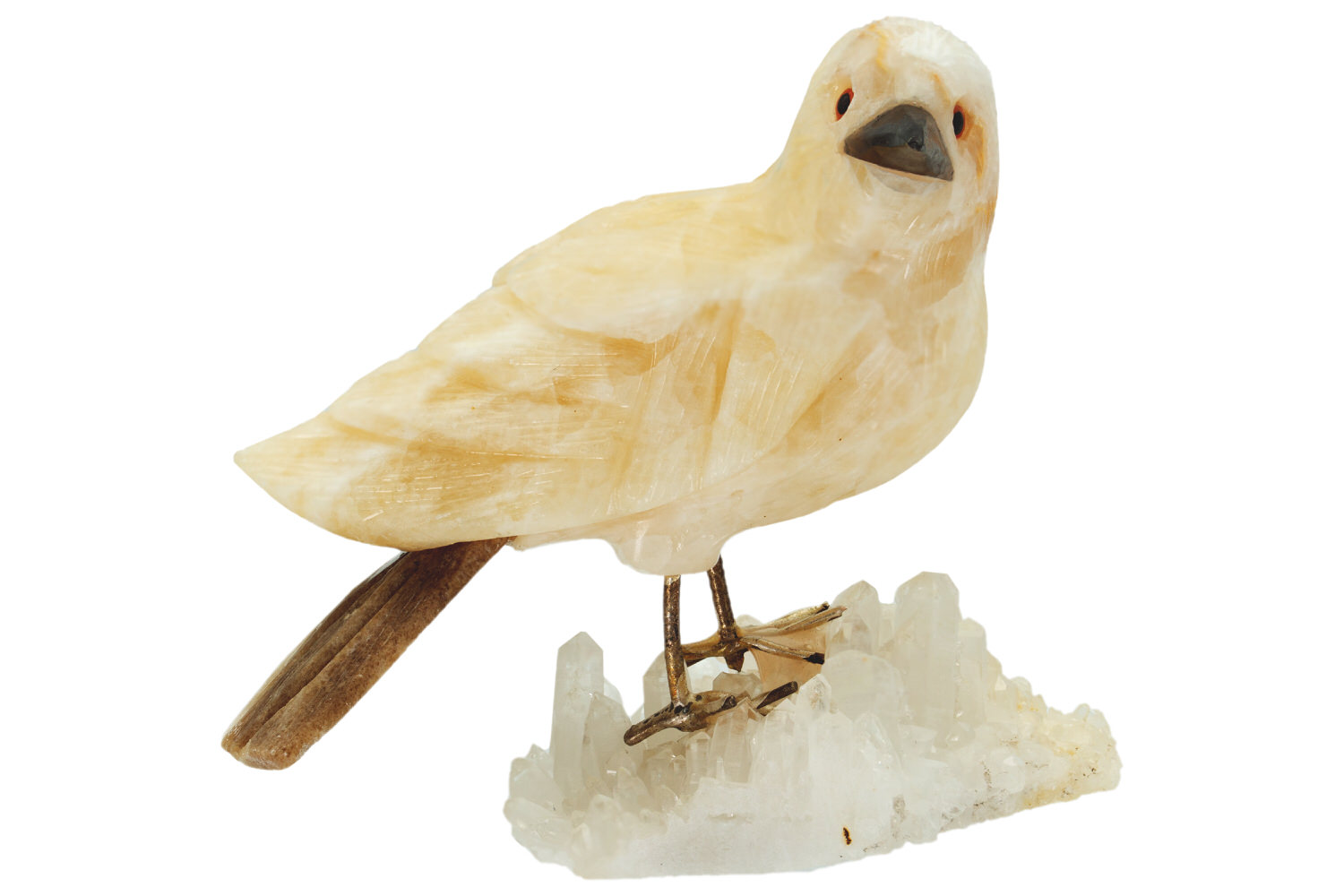 Gravur eines Finken. Körper und Gefieder sind aus gelbem Calcit gearbeitet, die Schwanzfedern aus grau-beigem Aragonit. Der liebevoll gearbeitete Vogel sitzt auf einer Bergkristallstufe.