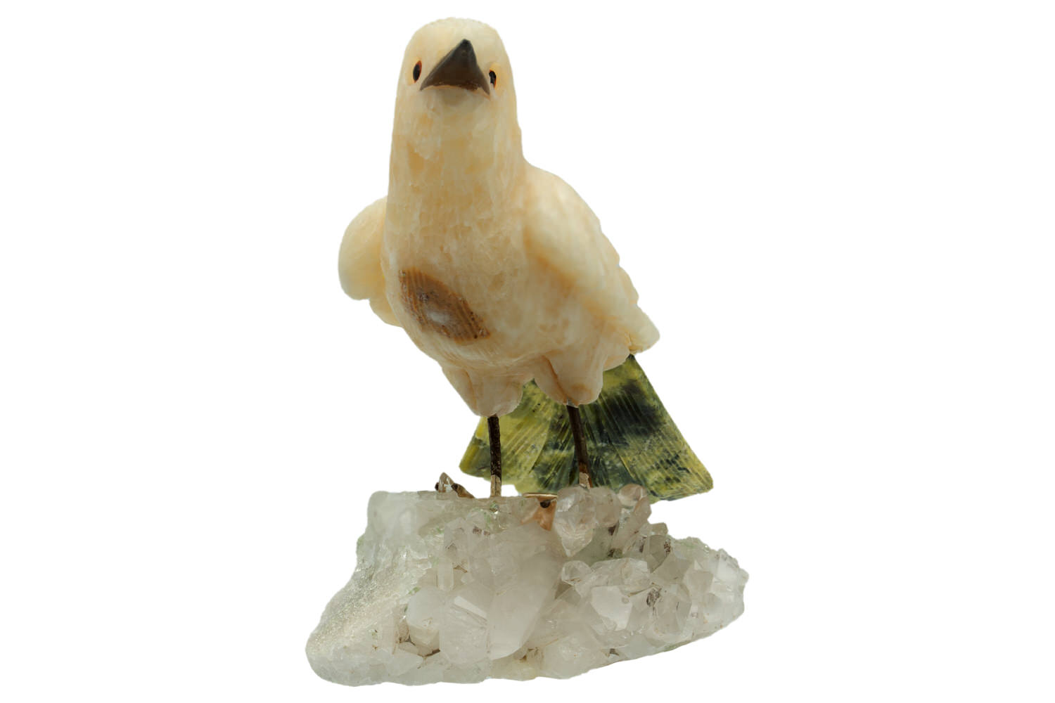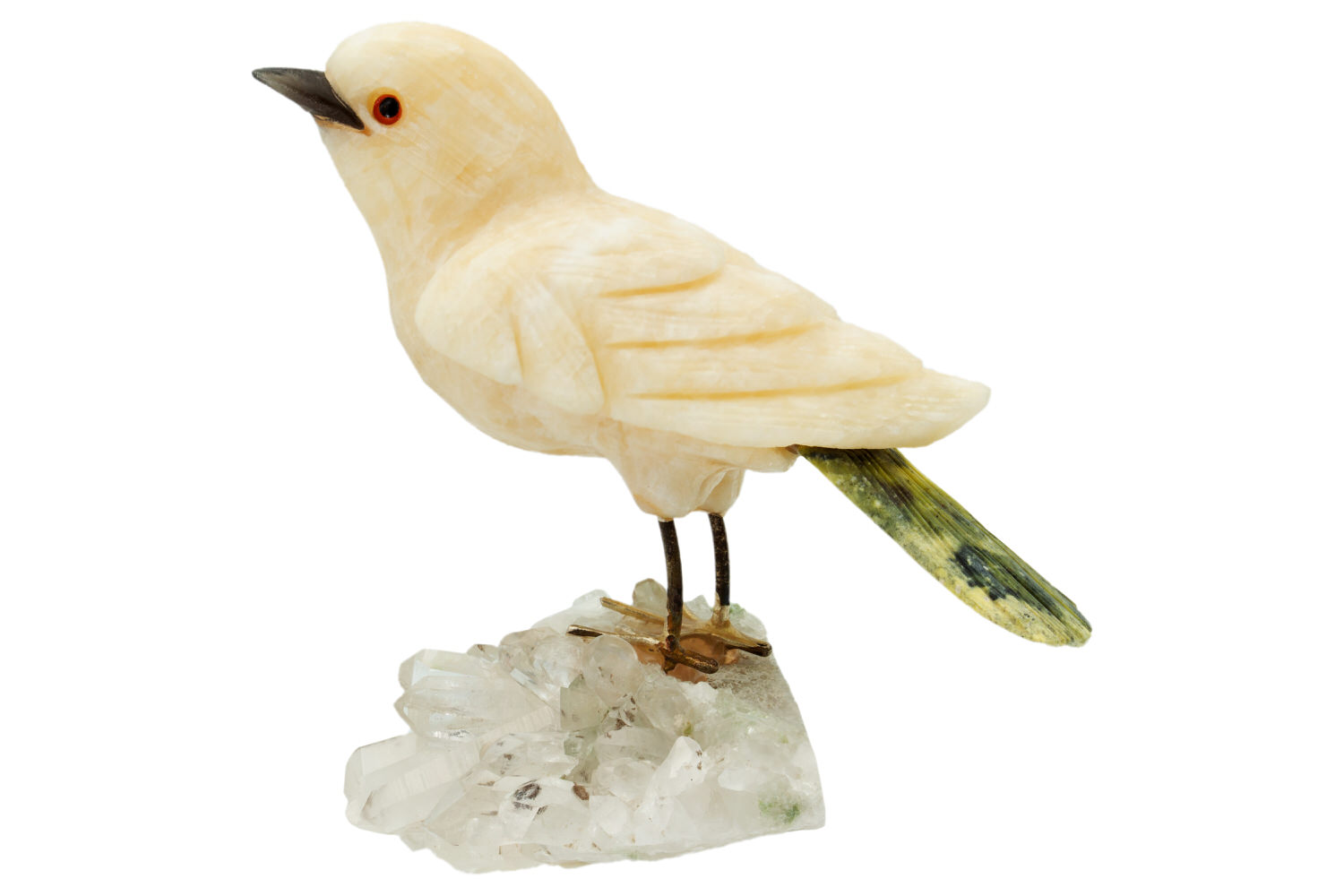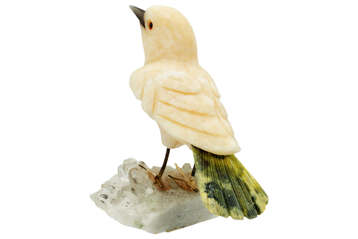 Gravur eines Finken. Körper und Gefieder sind gelbem Calcit gearbeitet, die Schwanzfedern aus grün geflecktem Serpentin. Die naturgetreue Edelstein-Schnitzerei ist auf einer Bergkristall-Stufe montiert.