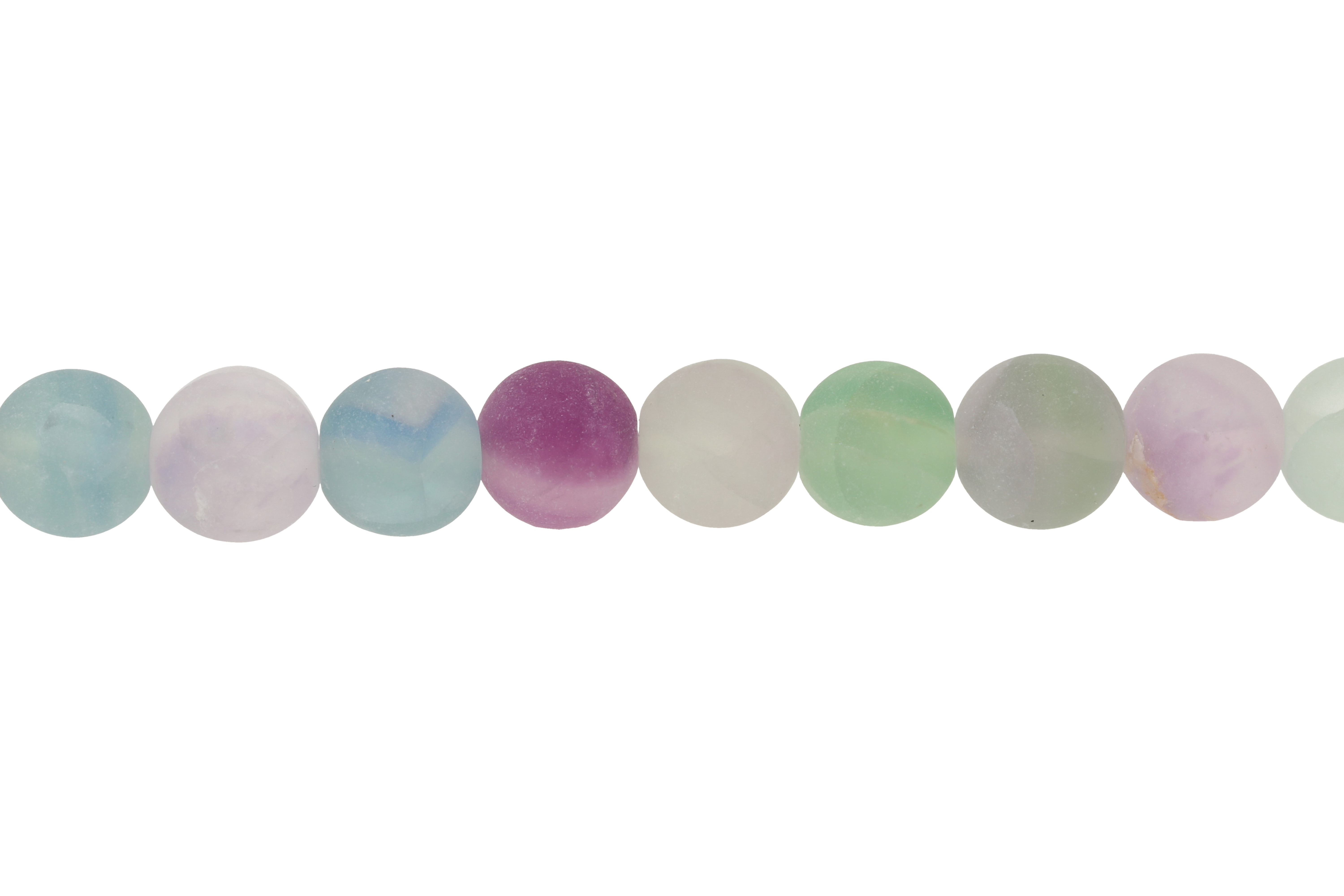 8mm-Kugeln aus mattem Fluorit. Durch die Mattierung haben die Rosa-, Grün, Lila und Blautöne ein weiches pastellfarbenes Aussehen. Sehr charmant und feminin.