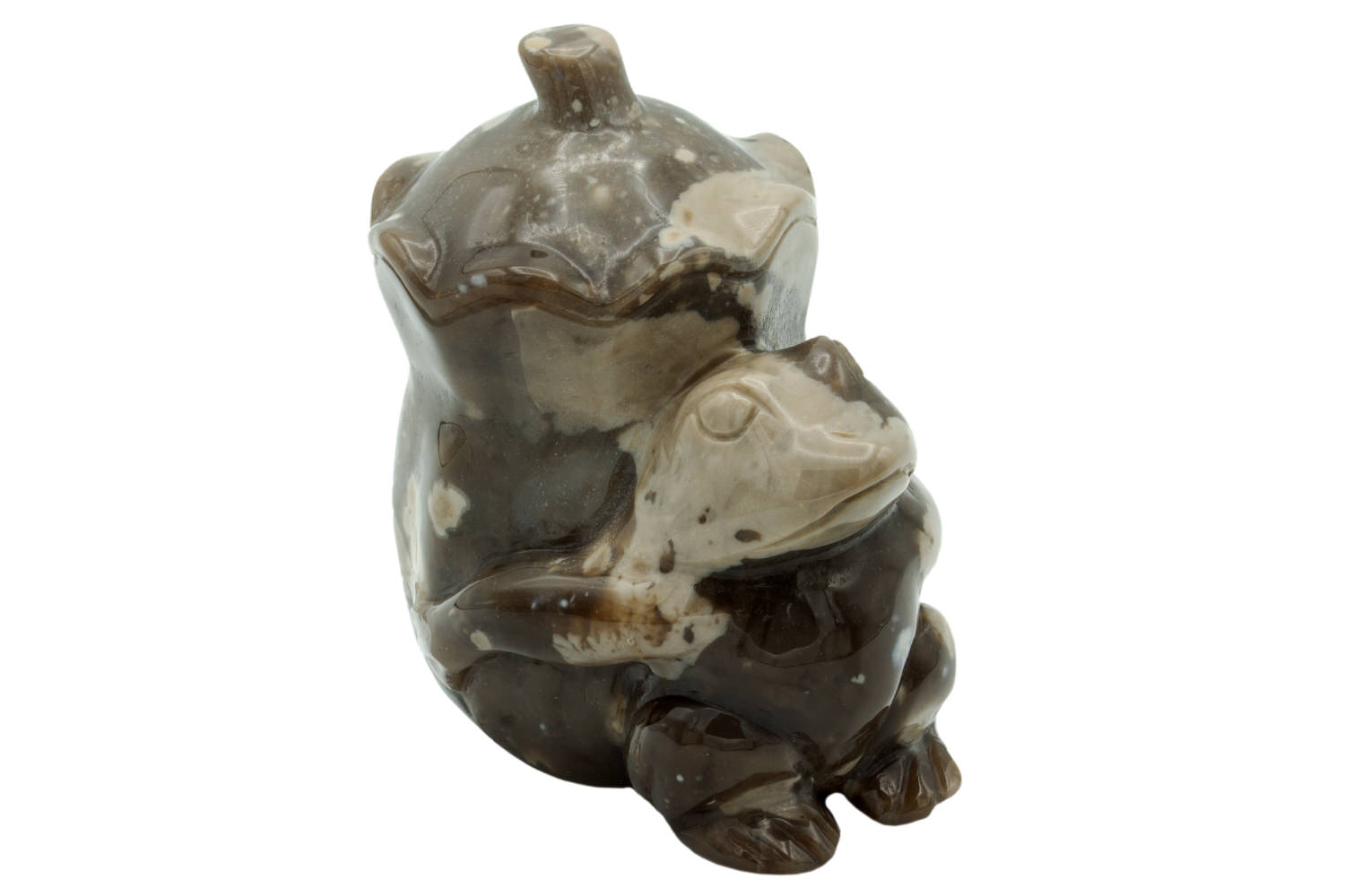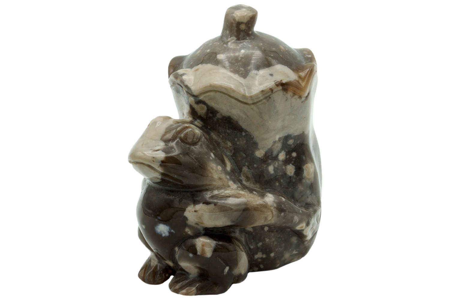 Gravur eines Frosches mit einem Kürbis auf dem Rücken. Die meisterliche Edelstein-Schnitzerei ist aus hochglanzpoliertem Flintstein gearbeitet. Der beige-graue Feuerstein unterstreicht diese lustige Figur vortrefflich.
