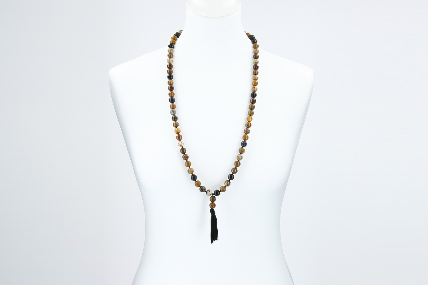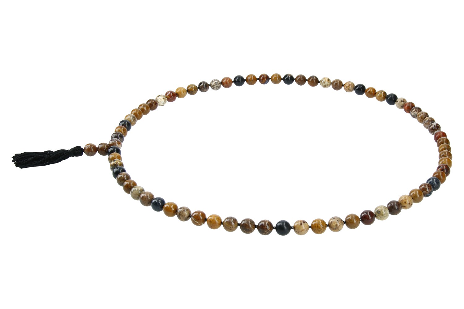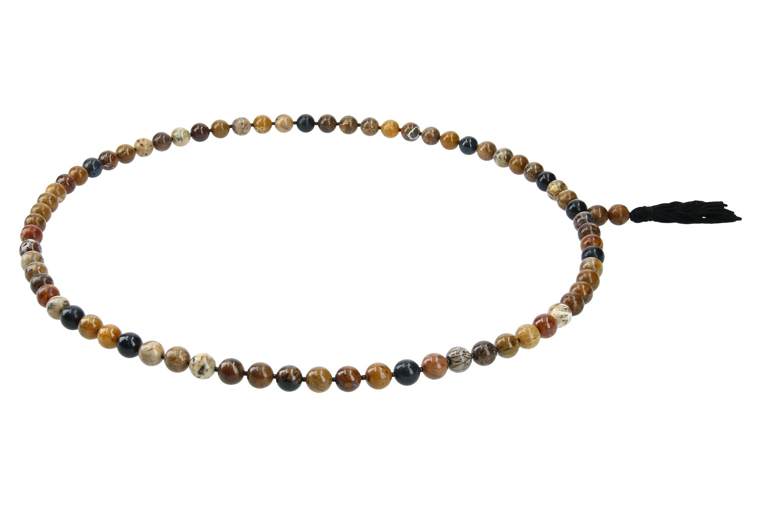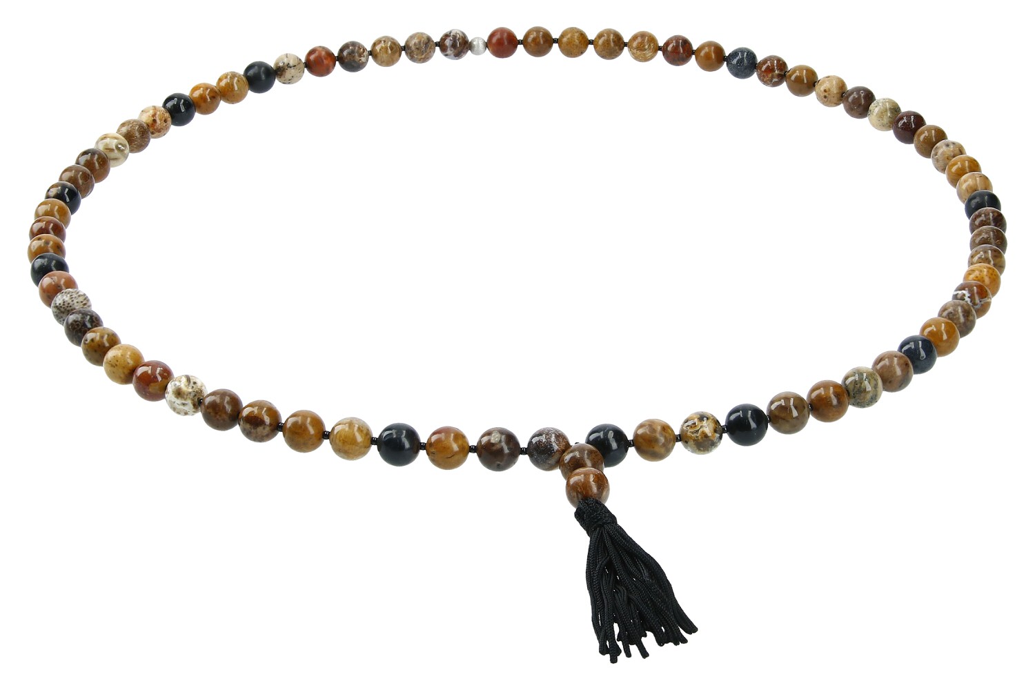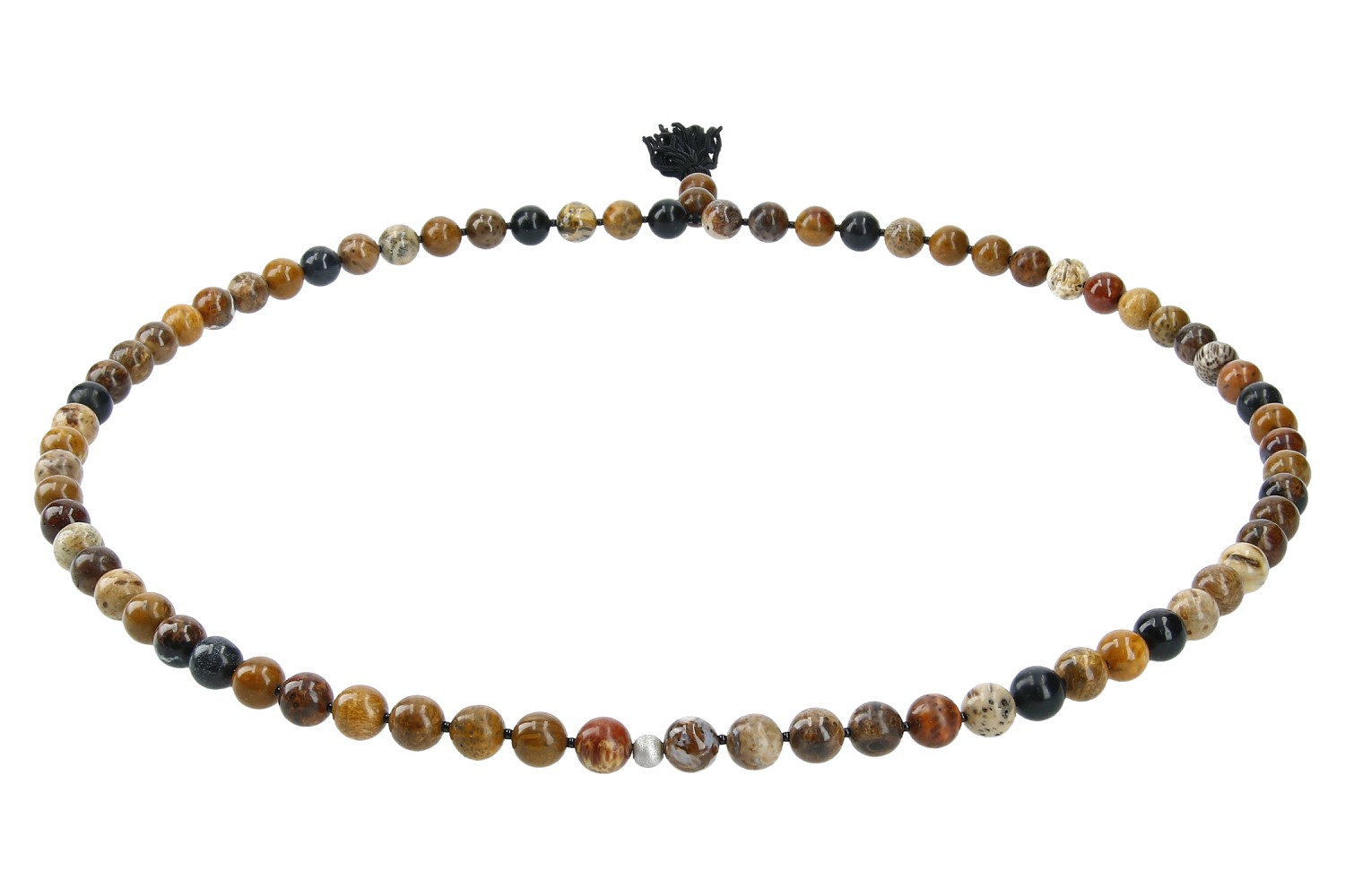 Modische Herrenkette mit Kugel aus Fossiler Koralle. Das Farbspektrum der versteinerten Koralle reicht von gelb, ocker über rötlich, braun bis grau und schwarz. Zwischen die interessant gezeichneten Korallenkugeln sind kleine schwarze Kügelchen aus Onyx gereiht. Die 80cm lange, modische Kette ist am unteren Ende mit einer schwarzen Quaste versehen. Ein hochaktuelles, trendiges Schmuckstück aus unserer Werkstatt.