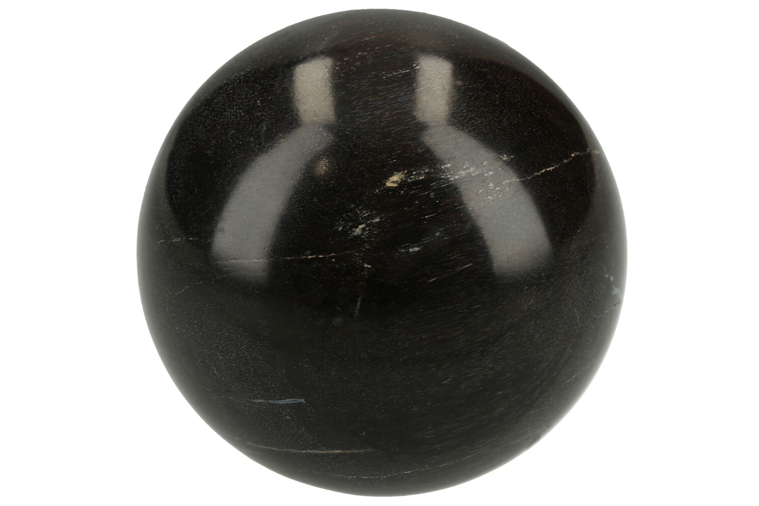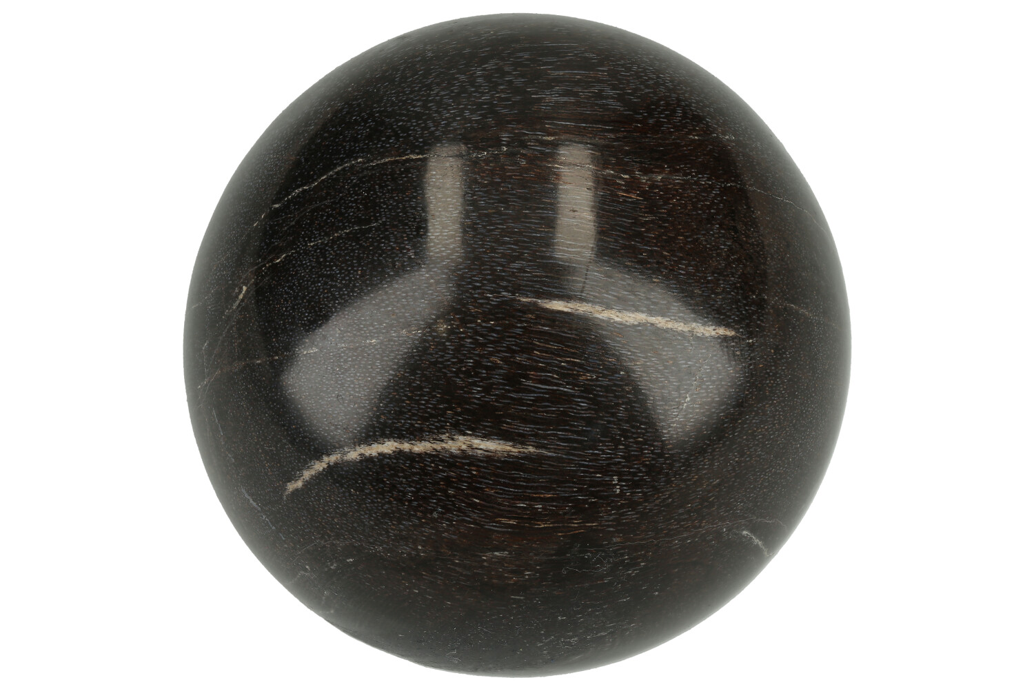 Kugel aus versteinertem Holz. Das verkieselte Holz ist schwarz mit beigem Einlagerungen.