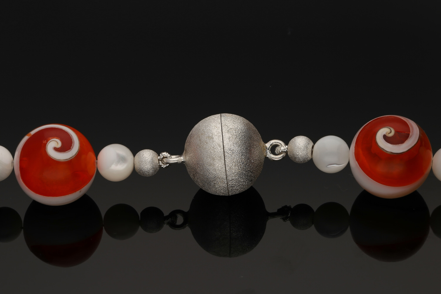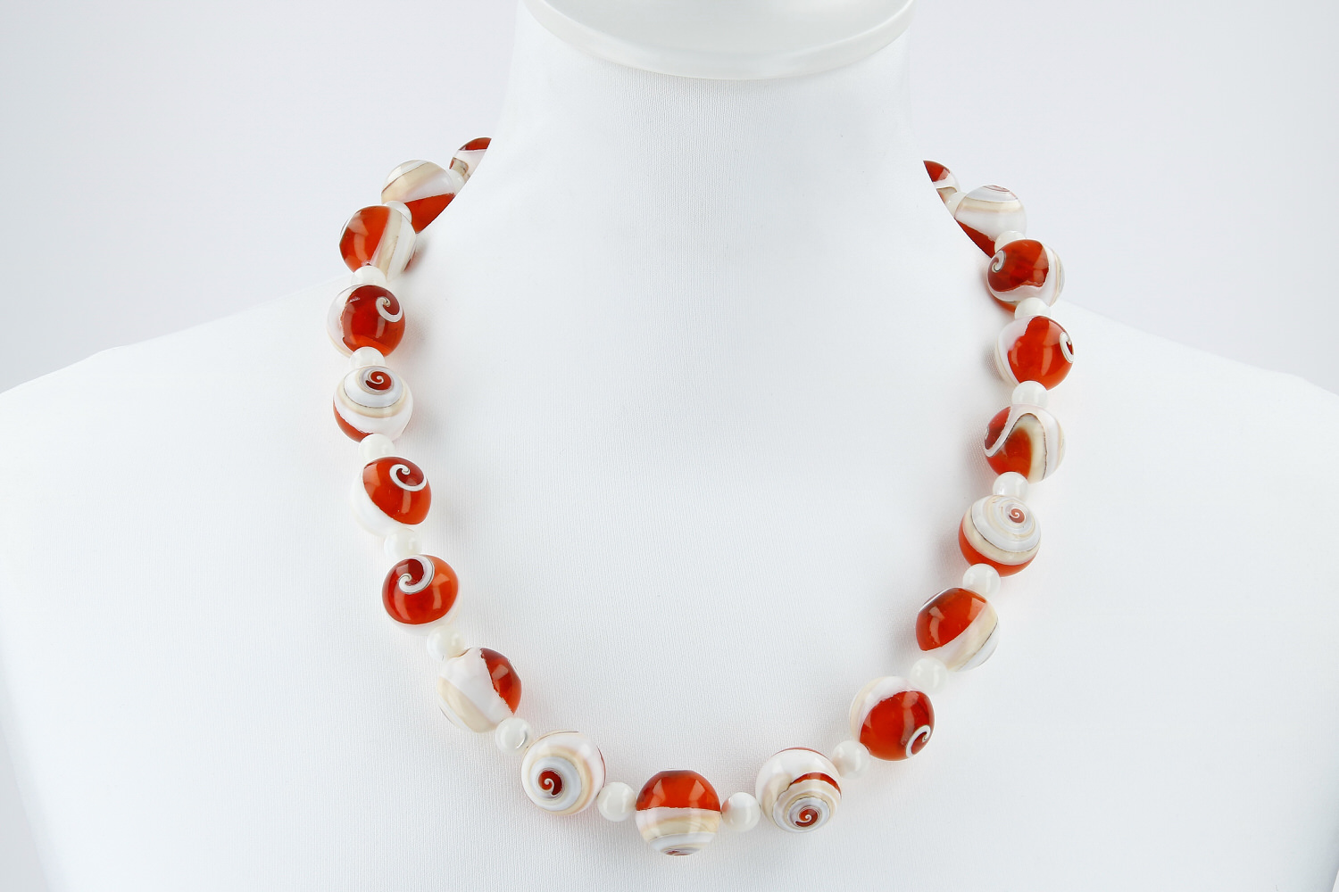 Eine sommerliche Kette mit weiß-orangen Kugeln aus Operculum (Shiva Eye). Die Operculumstücke sind mit orangefarbenen Kunstharz aufgefüllt und zu Kugeln geschliffen. Dazwischen sind weiße 8mm Kugeln aus schillerndem Perlmutt gereiht. Das aparte Schmuckstück ist auf Edelstahl gefädelt und mit einer kräftigen runden Magnetschließe aus mattiertem Sterlingsilber ausgestattet. Eine attraktives Erscheinungsbild mit dem dekorativen orange-weißen Kontrast. Ein echtes Unikat aus unserer Werkstatt.