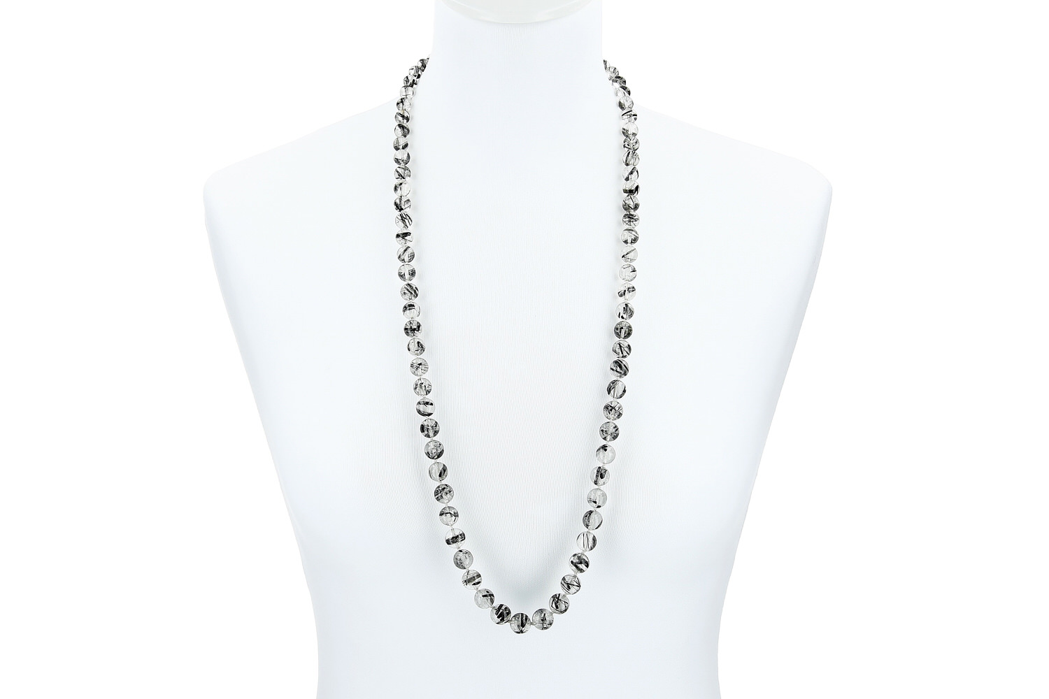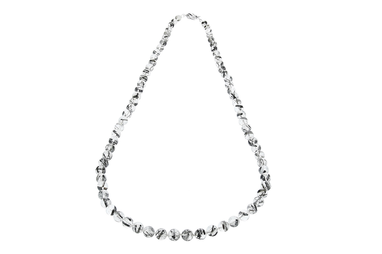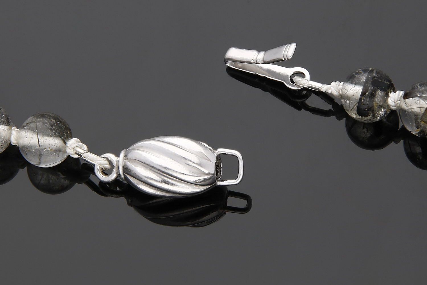 Kugelkette aus transparentem Turmalinquarz. Die schwarzen Turmalinkristalle sind klar und deutlich zu sehen. Die Kette ist einzeln auf Seide geknotet und mit einer verzierten, tönnchenförmigen Schließe aus Sterlingsilber versehen. Ein originelles Schmuckstück aus unserer Werkstatt.