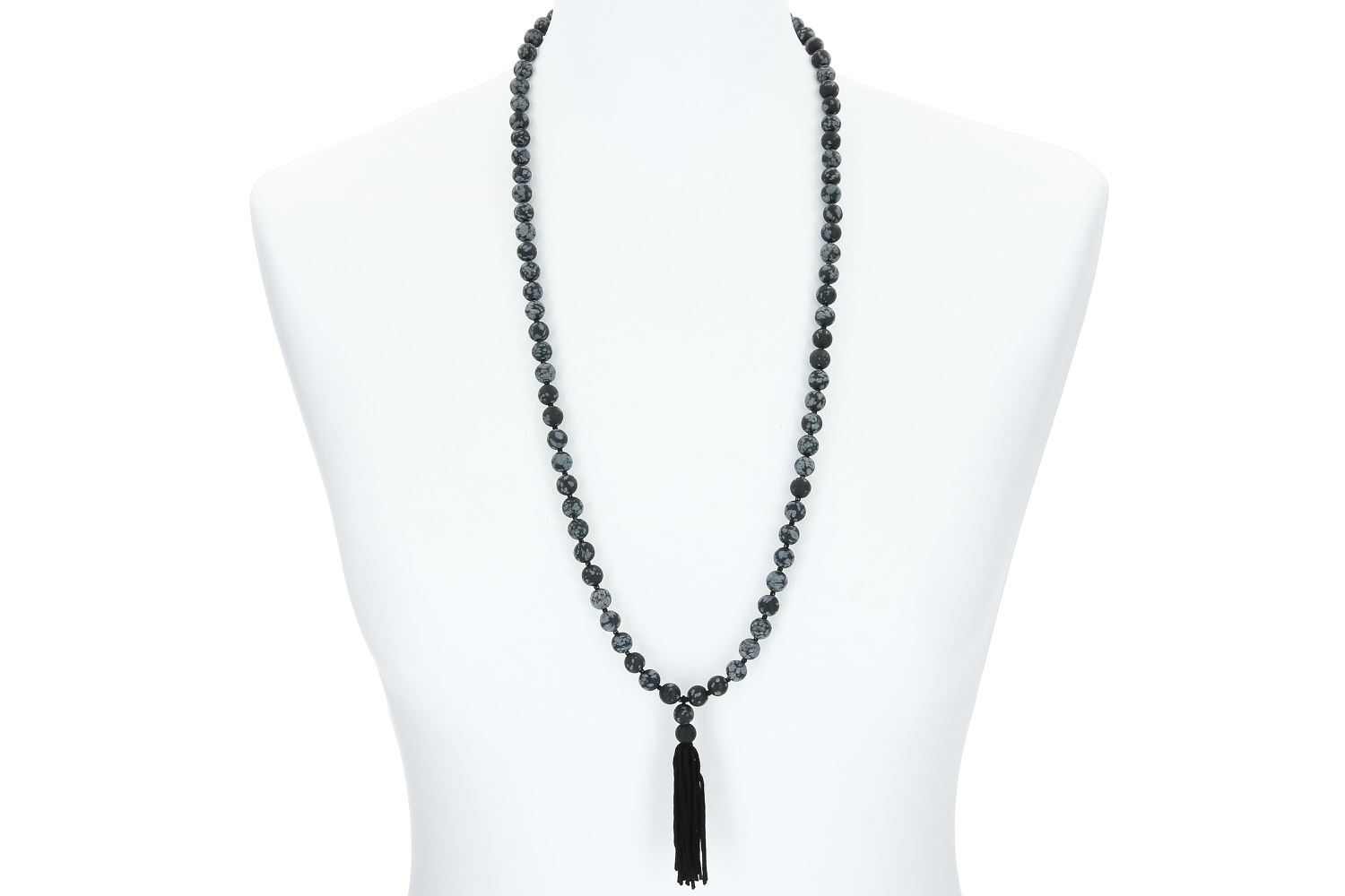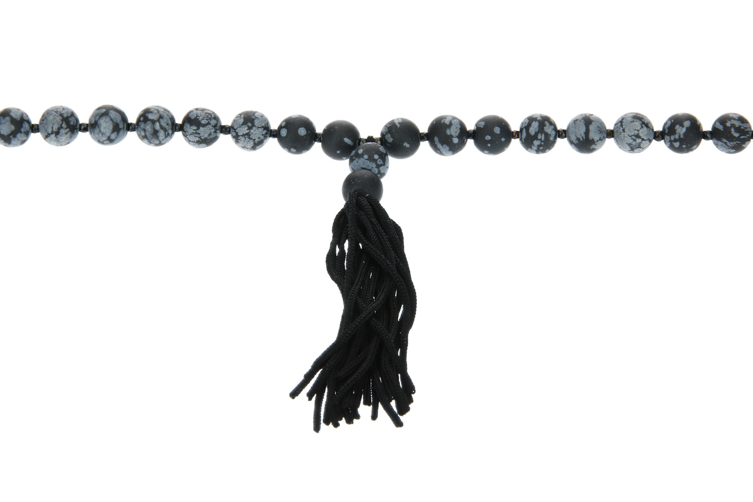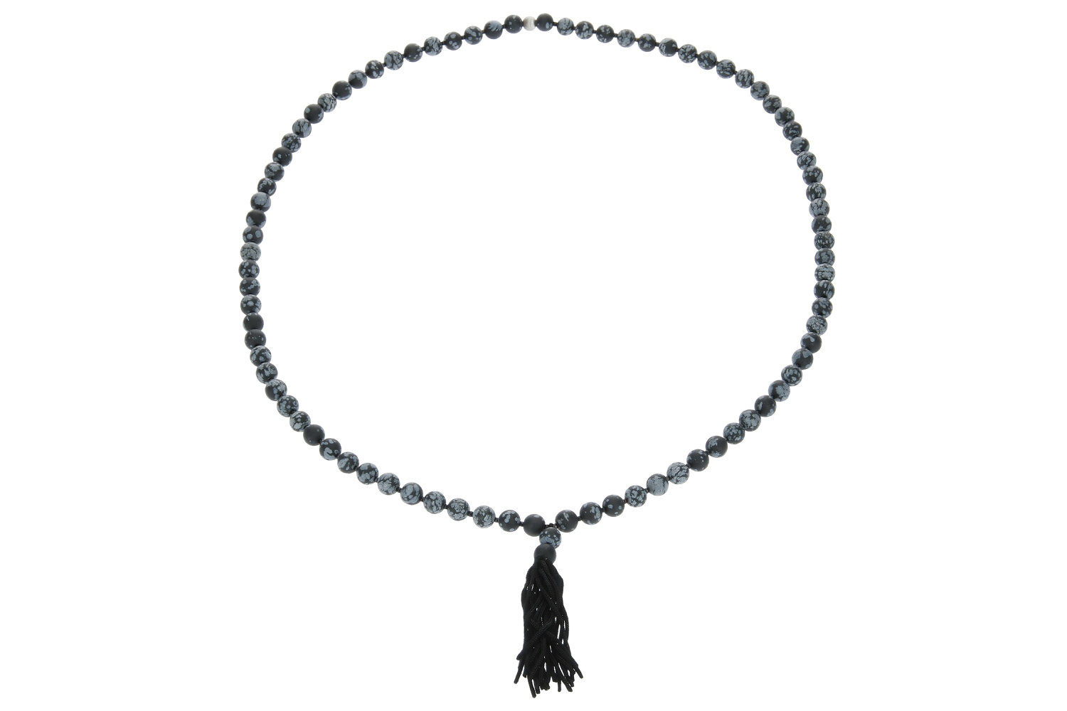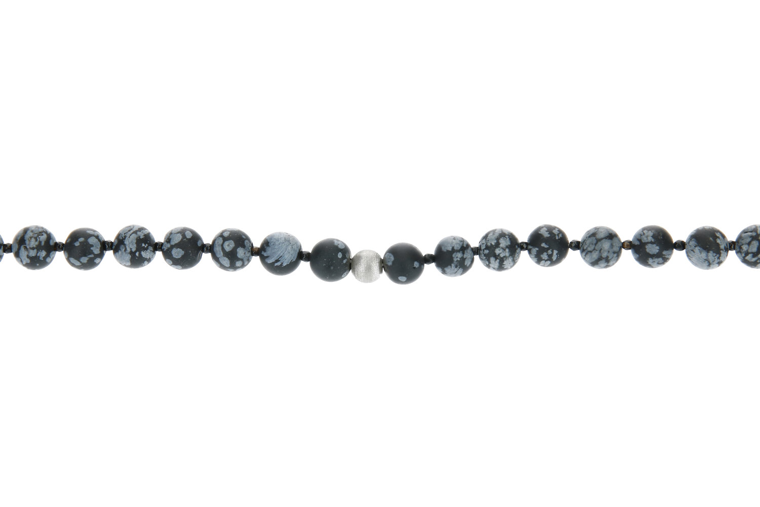 Modische Kugelkette mit mattierten Kugeln aus Schneeflockenobsidian. Der Edelstein zeigt die typische Maserung von grauweiß auf schwarz. Zwischen die interessant gezeichneten Kugeln sind kleine facettierte Kugeln aus schwarzem Onyx gereiht. Die 77cm lange, modische Kette ist mit einer matt gebürsteten Kugel aus Sterlingsilber versehen, das untere Ende ist einer Mala ähnlich mit einer schwarzen Textilquaste geschmückt. Ein hochaktuelles, trendiges Schmuckstück aus unserer Werkstatt, für Sie und für Ihn...