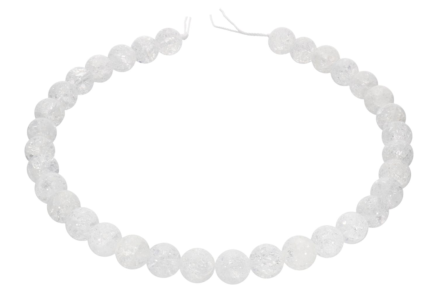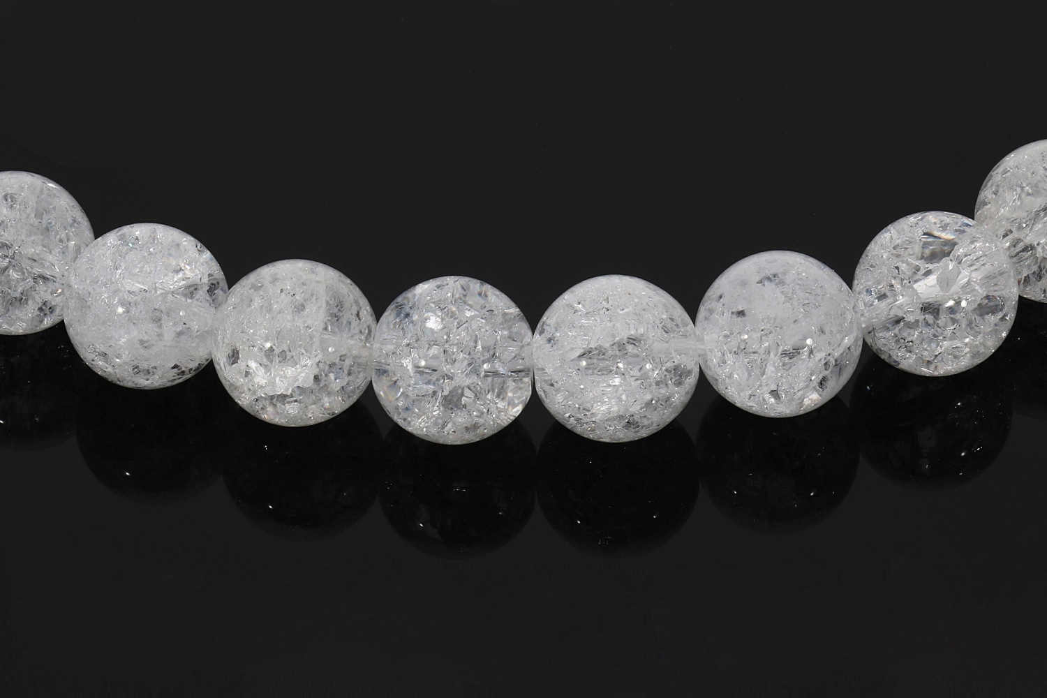 12mm-Kugeln aus gecrashtem Bergkristall. Für diesen schillernden Effekt wird der Bergkristall erhitzt und anschliessend kalt abgeschreckt.