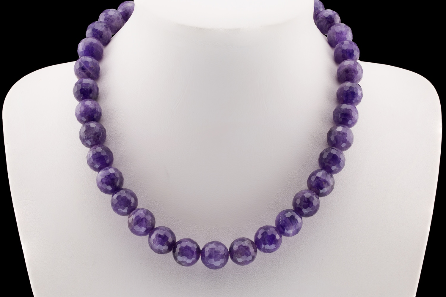 Facettierte violette Kugeln aus Cape-Amethyst mit seiner typischen weißen Bänderung. Jede einzelne Kugel besitzt 128 Facetten, welche dieser Ware noch einen zusätzlichen Effekt verleihen.