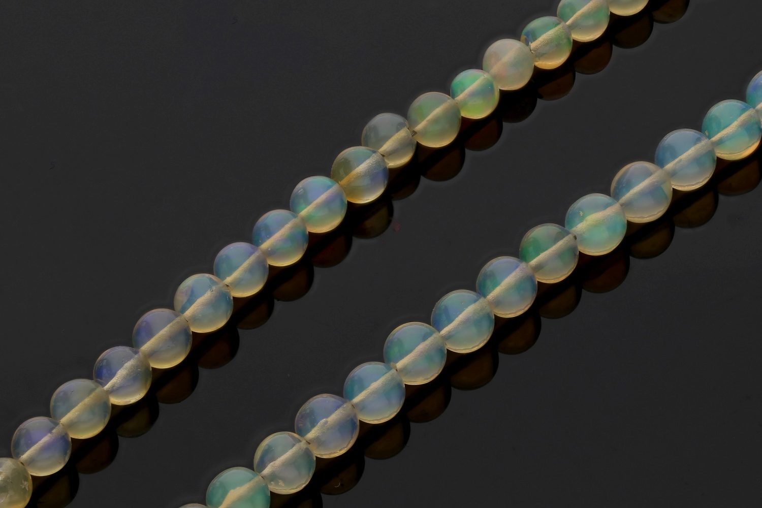 Transparente, feine Opalkugeln mit Farbspiel in blau, rot und grün. Sauber gebohrte Kugeln in sehr, sehr guter Qualität. Wir weisen darauf hin, dass Opale sehr sensibel auf Flüssigkeiten und Kosmetika reagieren. Der äthiopische Opal kann bei längerer Berührung mit Wasser trüb werden, gewinnt nach dem Trocknen in der Regel jedoch meist sein Farbspiel zurück.
