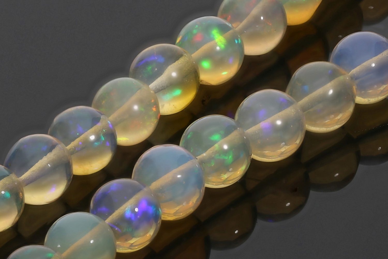 Transparente, feine Opalkugeln mit Farbspiel in blau, rot und grün. Sauber gebohrte Kugeln in sehr, sehr guter Qualität. Wir weisen darauf hin, dass Opale sehr sensibel auf Flüssigkeiten und Kosmetika reagieren. Der äthiopische Opal kann bei längerer Berührung mit Wasser trüb werden, gewinnt nach dem Trocknen in der Regel jedoch meist sein Farbspiel zurück.