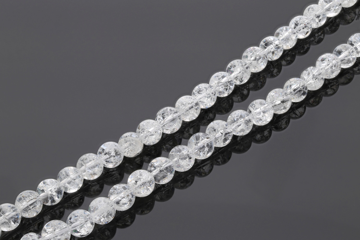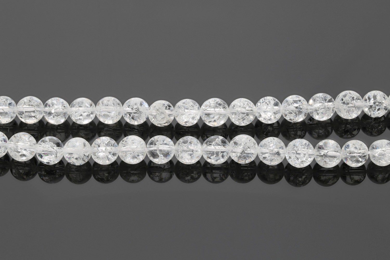 8mm Kugeln aus gecrashtem Bergkristall. Bergkristall wird erhitzt und dann kalt abgeschreckt. Durch die plötzliche Abkühlung entstehen Spannungsrisse, welche für die interessante Struktur verantwprtlich sind.
