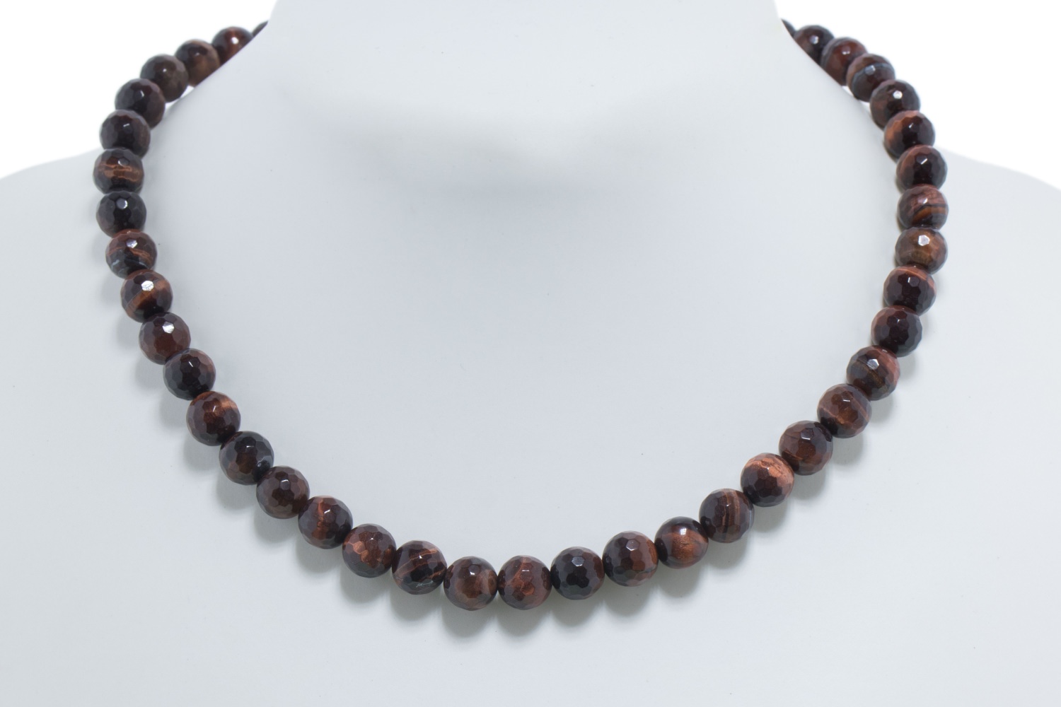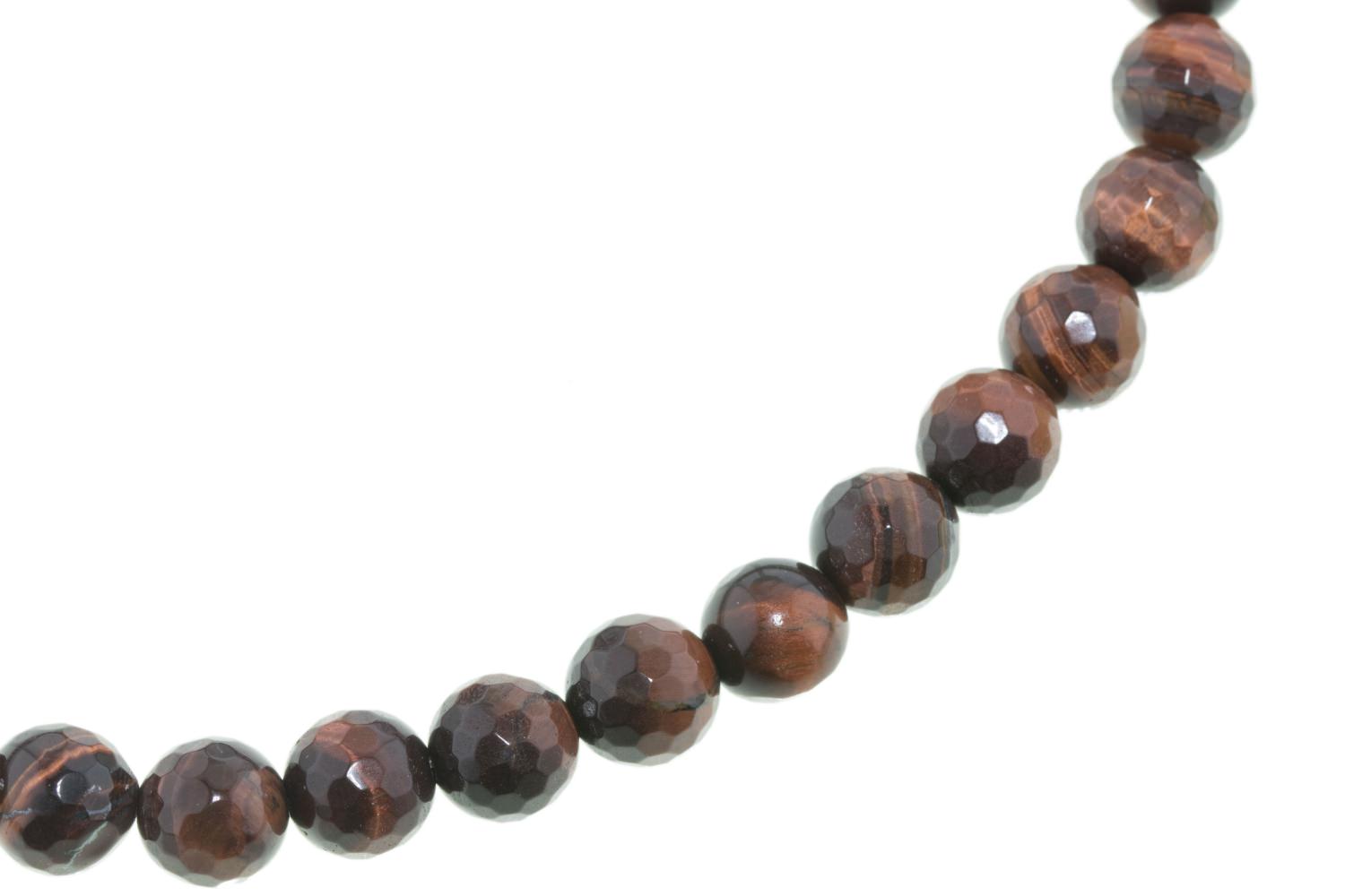 Facettierte Kugeln aus rotem Tigerauge. Die faszinierende Chatoyance (Katzenaugeneffekt) entsteht durch die parallele Ausrichtung der Kristalle. Die rotbraune Farbe erhält das zuvor goldbraune Tigerauge durch Erhitzen und gibt diesem Schmuckstück eine kupferbraune, erdige Note. Durch den Schliff mit 128 Facetten pro Kugel erhält dieser Edelsteinstrang eine brillante Ausstrahlung.