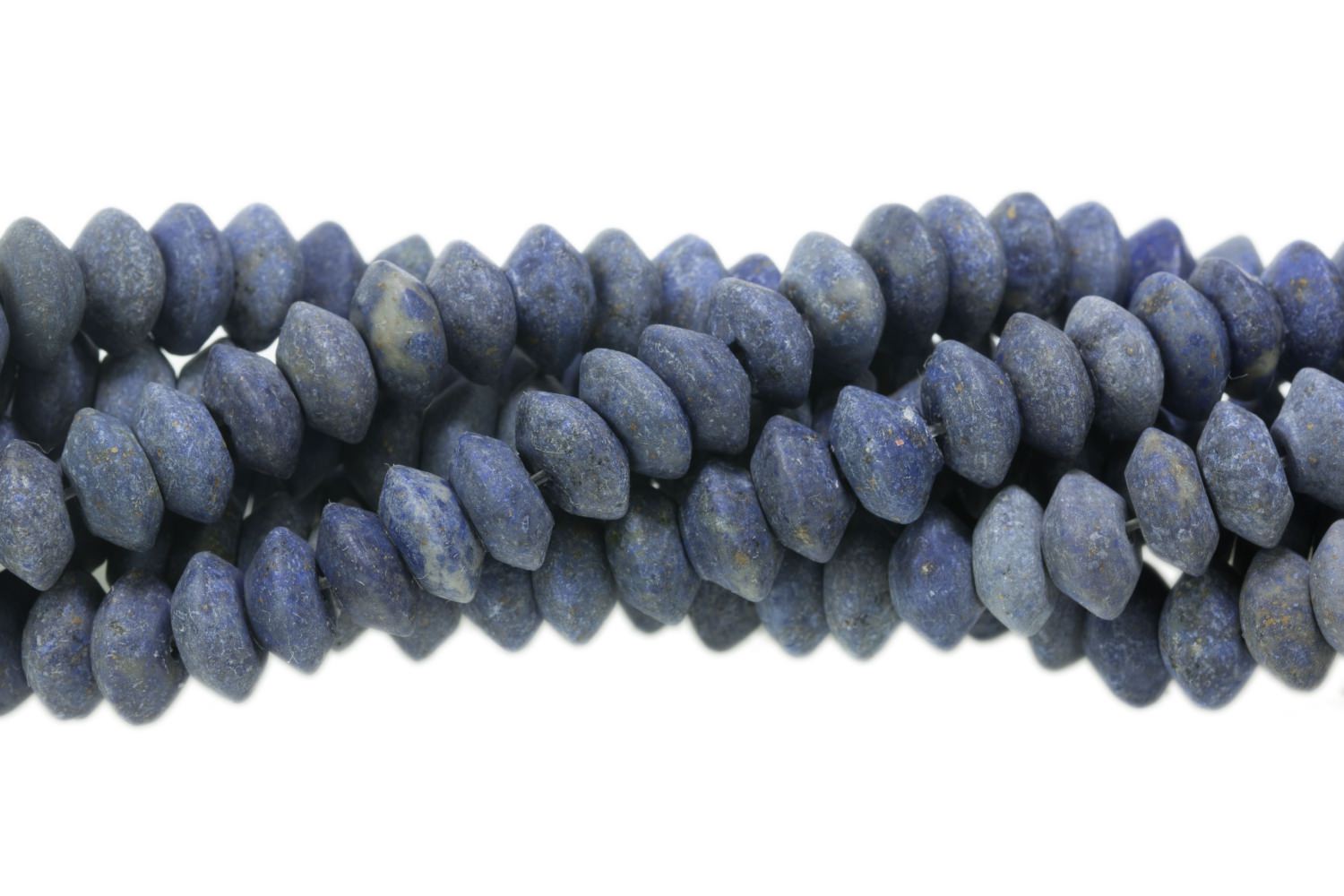 Mittig gebohrte Linsen aus mattem Dumortierit mit seinen variationsreichen Blautönen. Durch die Mattierung wirkt die Oberfläche weich und feminin. Der Edelstein Dumortierit ist erst seit dem Ende des 19.Jahrhundert bekannt und bildet sich in den Farben blau, grünlichblau, violett, rotviolett bis braunviolett aus. Als günstige Alternative zum Lapislazuli eignet sich dieser Strang in sehr guter Qualität für zahlreiche, elegante Designs.