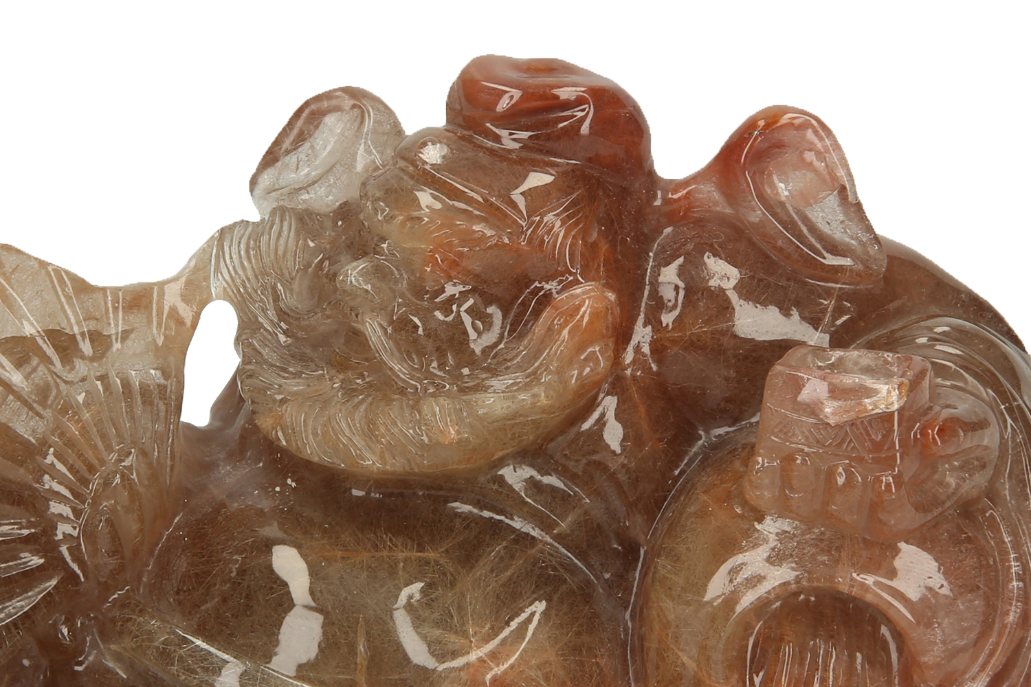 Perfekt geschnitztes Abbild des Lu, einem der 3 Weisen Chinas. Die drei Götter Fu, Lu und Shou werden 3 Glücksternen zugeordnet, wobei der Stern des Lu für den Wohlstand und Reichtum steht. Diese meisterhafte Gravur aus Kupferrutil zeigt den chinesischen Weisen entspannt sitzend mit Tael in der Linken und einem Fächer in der Rechten. Diese meisterliche Edelsteinschnitzerei ist aus rötlichem Kupferrutil gearbeitet. Deutlich ist die gleichmäßige und reichliche Verteilung der Rutilkristalle im Quarz zu sehen. Ein großartiges Exemplar für Sammler und Ästheten.