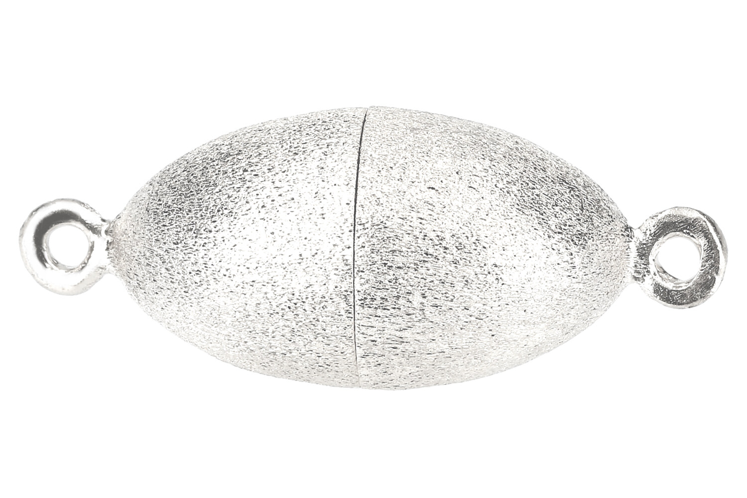 Magnetische Olivenschließe mit unsichtbaren Magneten, ummantelt mit mattem Sterlinsilber, erprobt zugkräftig und zuverlässig.