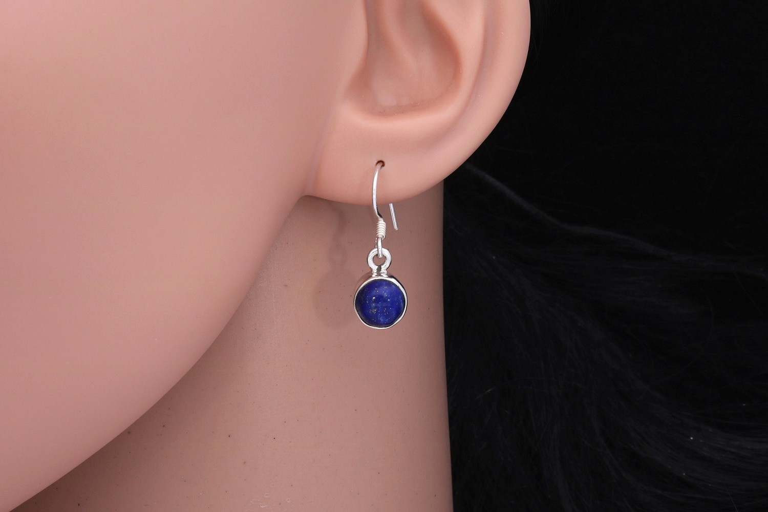 Ohrhänger mit einem runden 8mm-Cabochon aus dunkelblauem Lapislazuli. Dieser fein gearbeitete Ohrschmuck ist in Sterlingsilber gefasst. Die glatte Fassung und der stabile Haken aus Silber bilden einen hübschen Kontrast zu dem kräftigen Blau des Edelsteins aus Afghanistan.