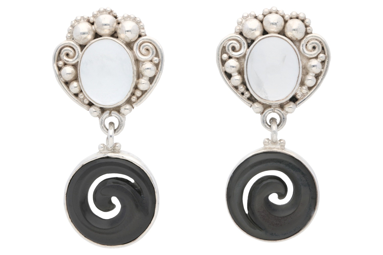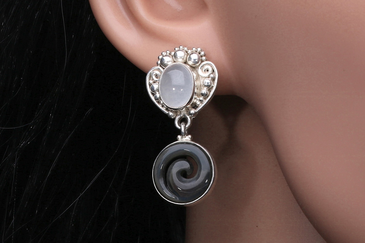 Ohrstecker mit ovalem,weißem Mondstein-Cabochon in einer mit Kugeln verzierten Ornamentalfassung aus feinem Sterlingsilber. Daran hängt eine Hämatin-Spirale in einer Zarge, ebenfalls aus Sterlingsilber. Ein ausgefallenes und anspruchsvolles Schmuck für jeden Anlass.
