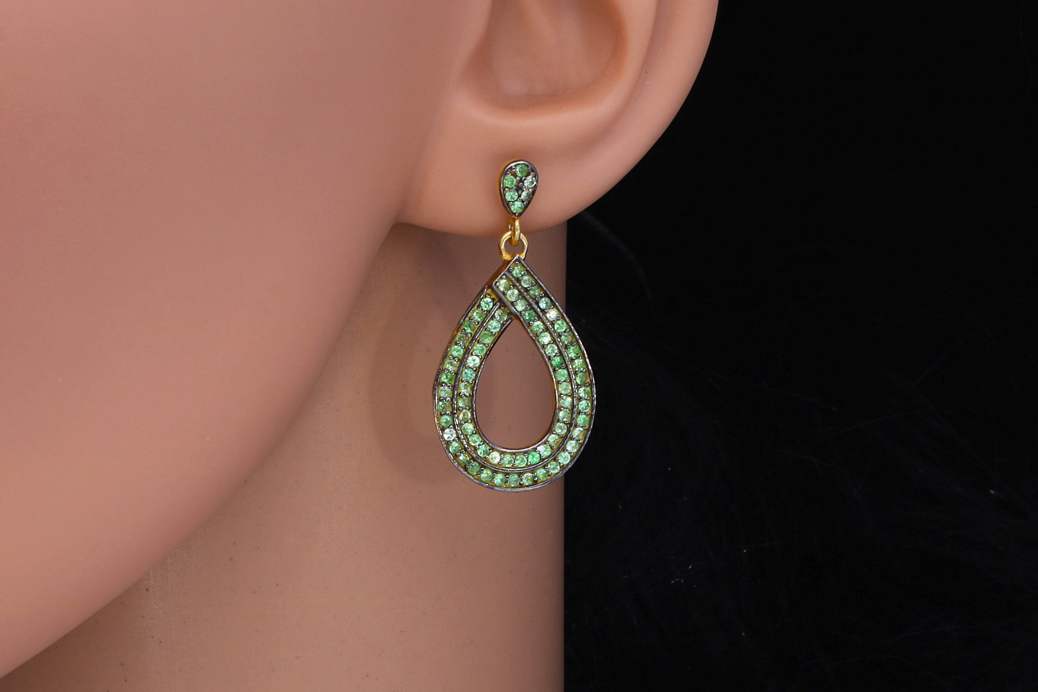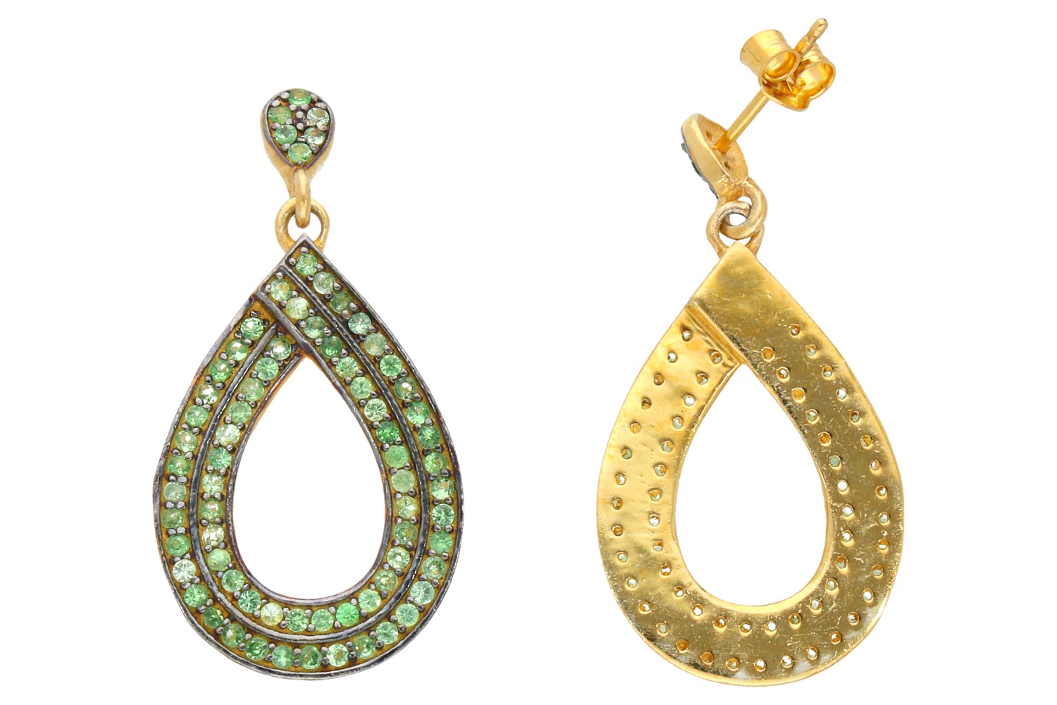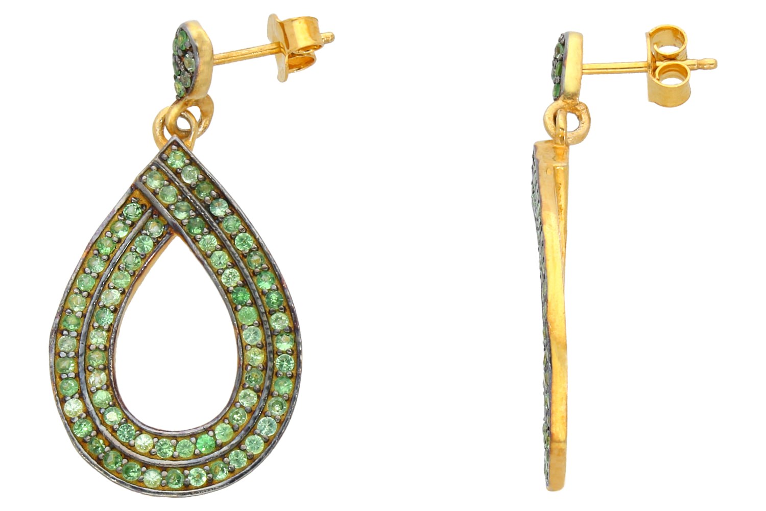 Tropfenförmige Schlaufe Ø 19x37mm mit zwei parallelen Reihen mit facettierten, runden Peridots. Auch der Ohrstecker darüber ist mit den gleichen grünen Edelsteinen besetzt.. Dieser elegante und feminine Ohrschmuck ist aus vergoldetem Sterlingsilber gearbeitet.