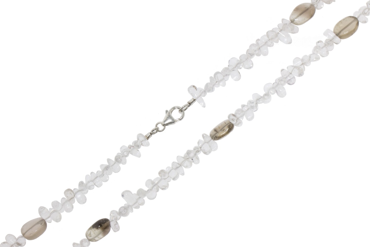 Versetzt auf Edelstahl gereihte Bergkristall-Pampeln mit 6 Rauchquarz Ovalen. Die Kette besitzt einen 10mm-Karabiner aus Sterlingsilber 925 und wirkt frisch und leicht.