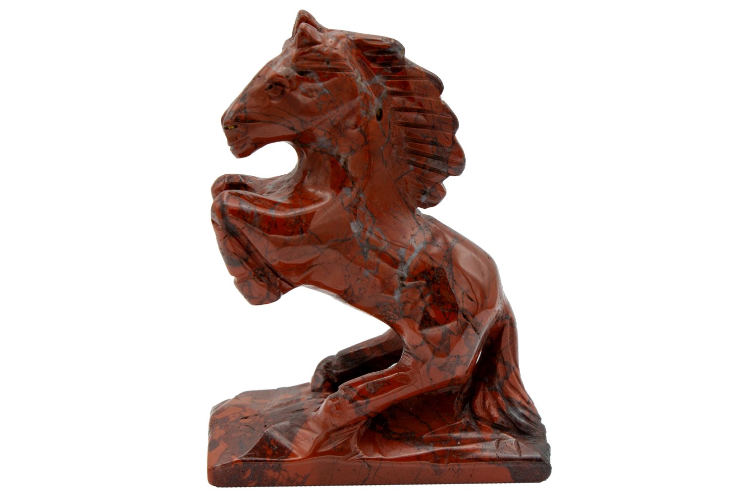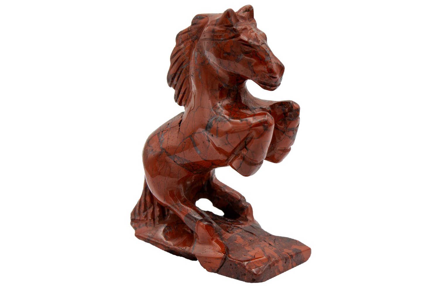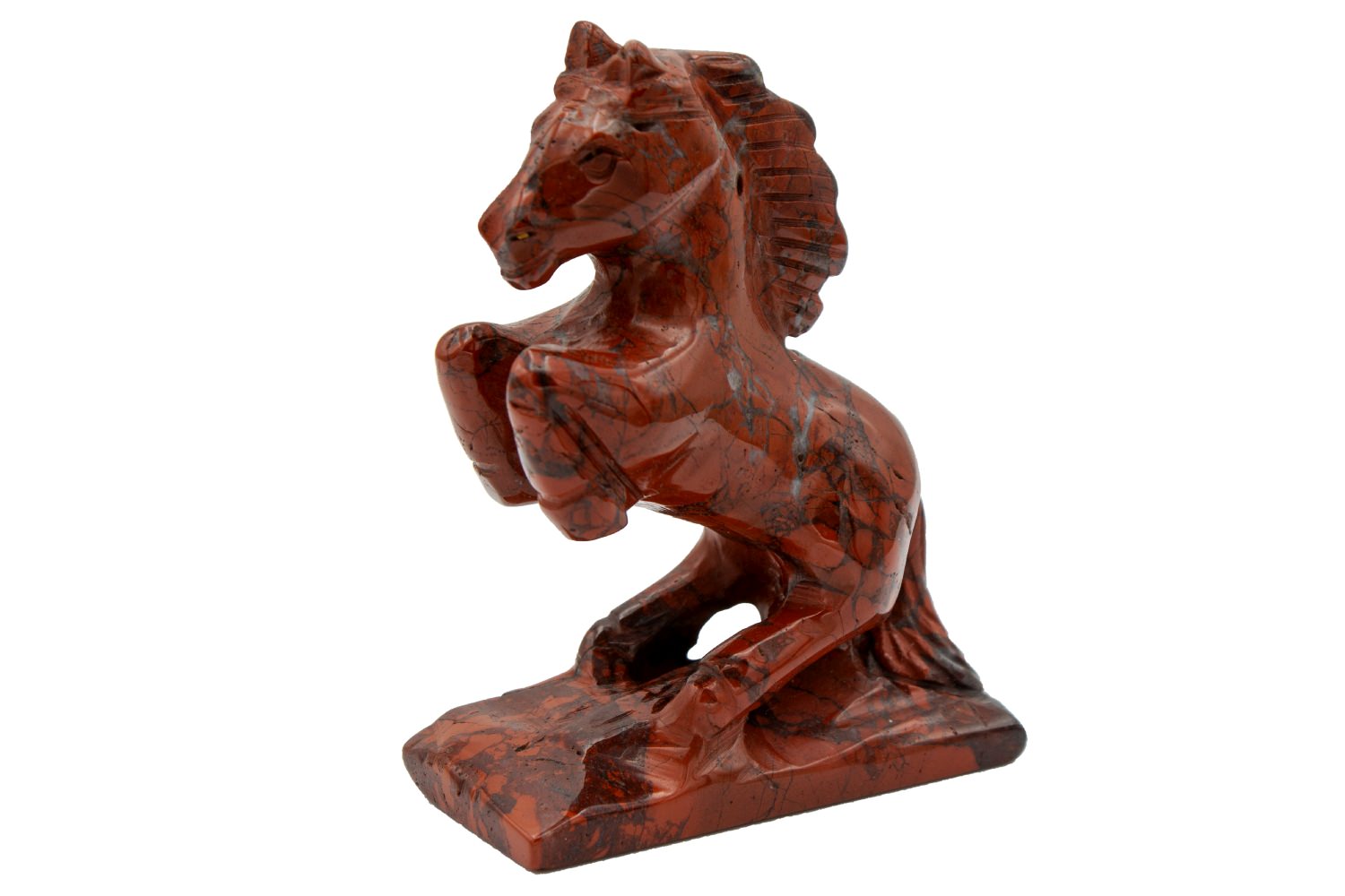 Schnitzerei eines Pferdes, welches sich auf den Hinterhufen stehend aufbäumt. Eine beeindruckende und detailgetreue Gravur aus Brekkzien-Jaspis mit seiner typischen, schwarz-rot-weißen Struktur.