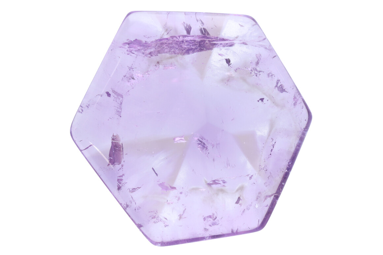 Der transparente, sechseckige Querschnitt eines Ametrinkristall zeigt zart den gelb-orangen... mehr