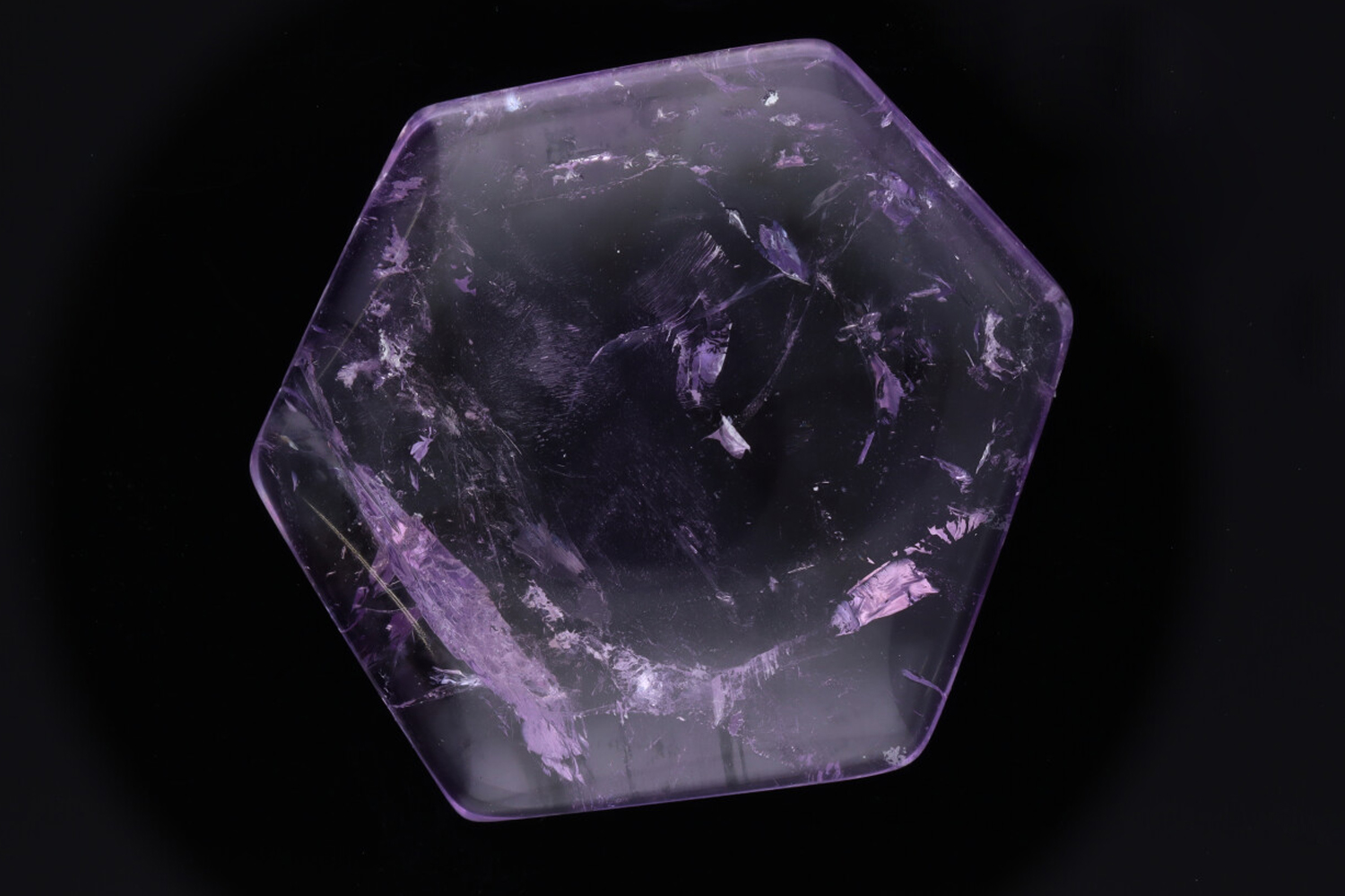 Der transparente, sechseckige Querschnitt eines Ametrinkristall zeigt zart den gelb-orangen Citrin im violetten Amethyst. Der Fundort ist die Anahi Mine in Santa Cruz, Bolivien. Natürlicher, nicht erhitzter Ametrin findet man nur In Bolivien und Brasilien. Ein sehr feines Exemplar dieses seltenen Edelsteins.