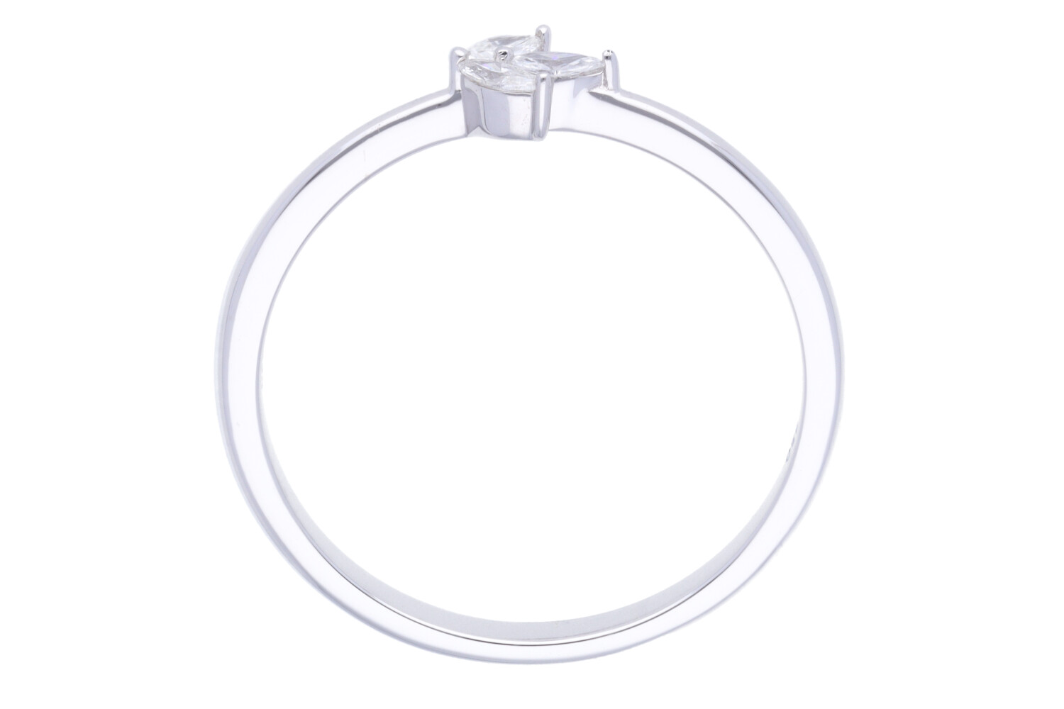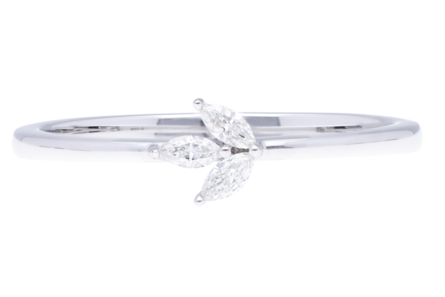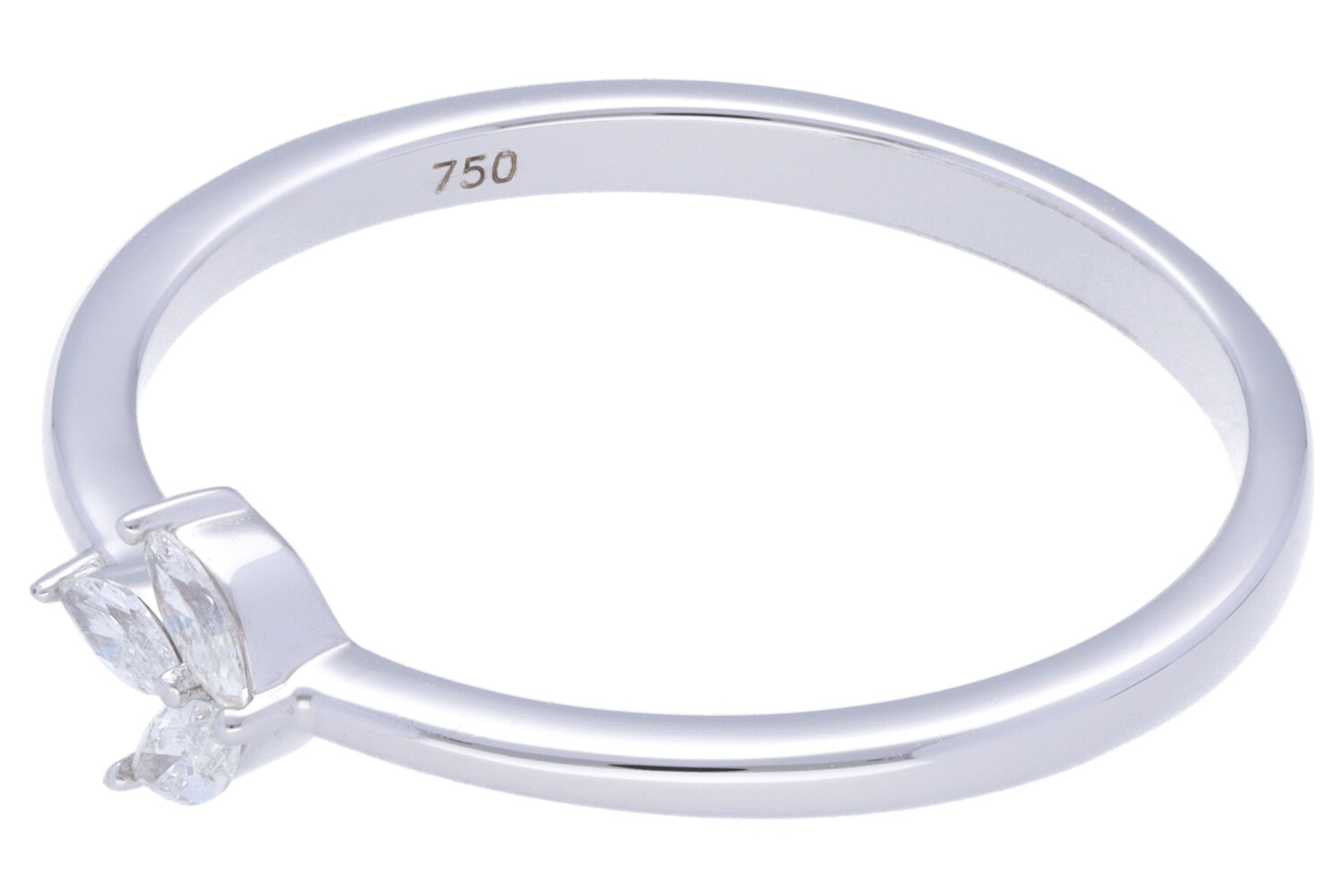 Weißgoldring mit 3 weißen Brillanten (Marquise - Schliff) in Form einer Blüte gefasst, aus feinstem 750er Weissgold. Die 3 weißen Brillanten haben zusammen 0,10ct. Dieser Ring mit der Größe 54 ist ein edles Schmuckstück in 18 Karat Weissgold. Die Ringschiene hat eine Breite von 1,9mm.
