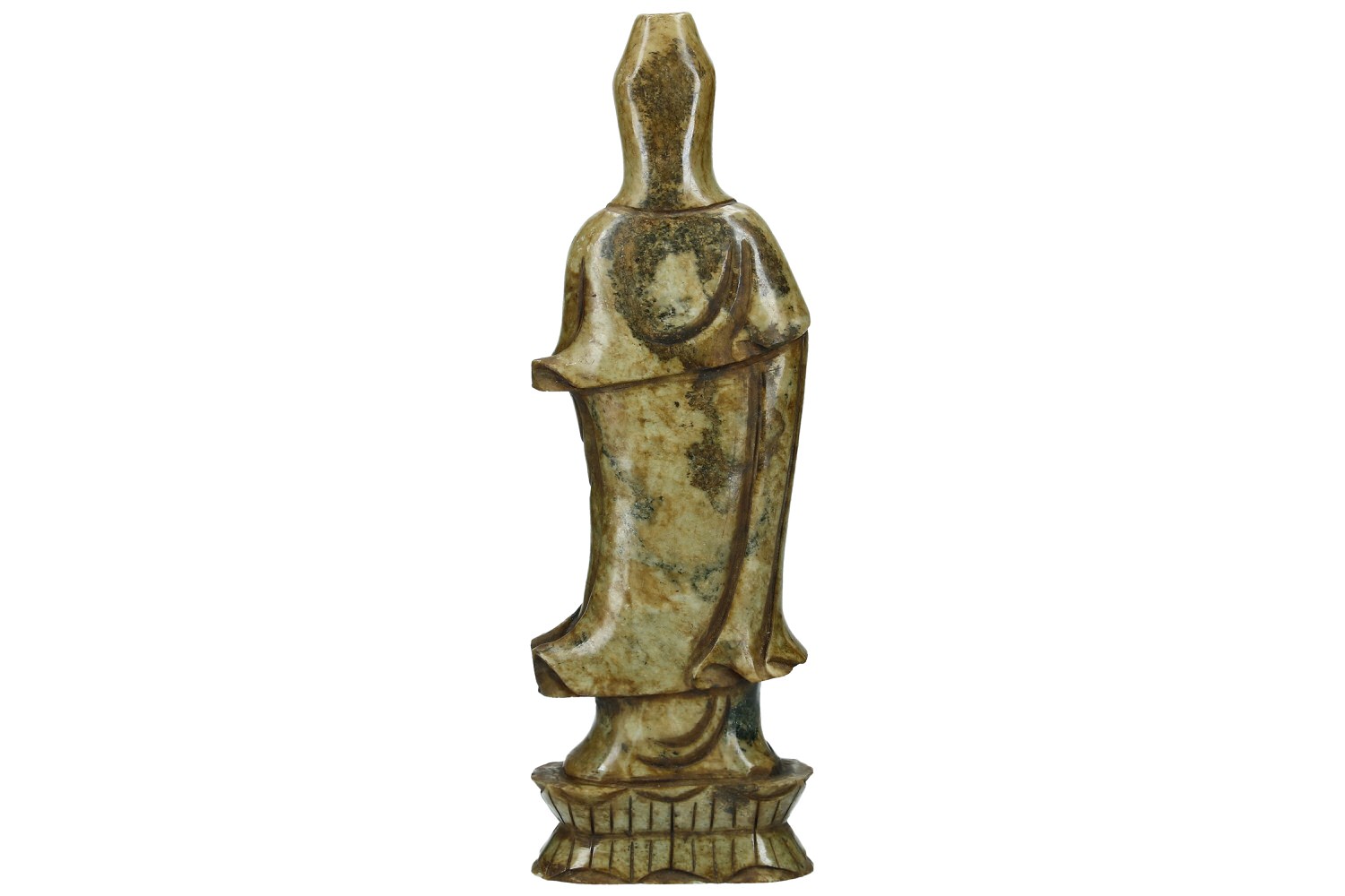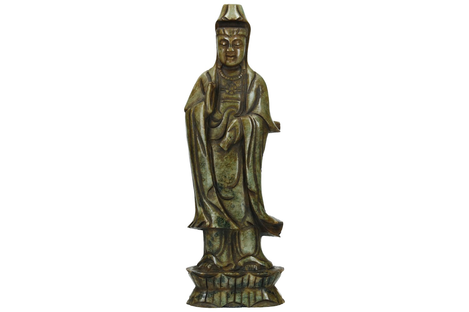 Stehende Guan Yin aus grünem, gebranntem Serpentin. Guan Yin symbolisiert die Beschützerin von Familie und Haushalt. Das Brennen des auch China Jade oder New Jade genannten Serpentins verschafft dieser Statue aus den 1990er Jahren einen antiken Eindruck.
