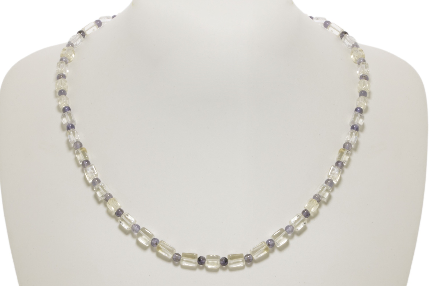 Längs gebohrte Quader aus hellgelben, ungebrannten Citrinen mi 3mm-Kugeln aus Iolith im Wechsel auf Edelstahl gefädelt. Die Kette besitzt einen 10mm-Karabiner aus Sterlingsilber 925. Ein leichtes Schmuckstück für Jung und Alt.