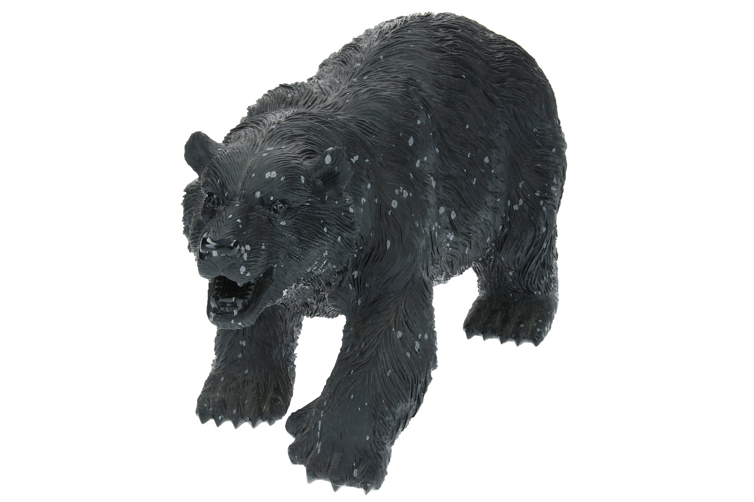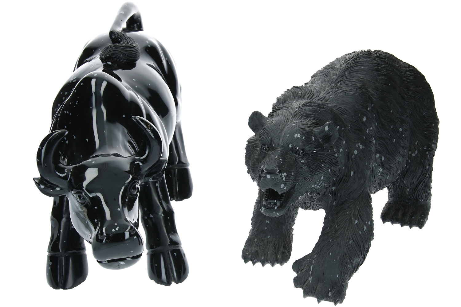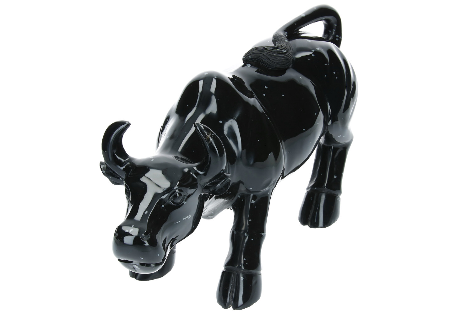 Stier und Bär aus schwarzem Schneeflocken-Obsidian mit weißen Punkten. Der Bär ist mattiert und das Fell ist detailgetreu graviert. Das 10kg schwere Bär mißt 41x18x19cm. Der symbolisiert an der Börse fallende Kurse. Er drückt sie mit seinen mächtigen Tatzen nach unten. Im Gegensatz dazu steht der Stier für steigende Aktienkurse, er stößt mit seinen Hörnern von unten nach oben. Die gelungene 43x16x21cm große Gravur zeigt die kräftigen Muskeln des polierten Stiers. Er hat ein Gerwicht von 10,5kg. Eine meisterliche Darstellung der bekannten Börsen Symbole, welche vor der New Yorker und der Frankfurter Börse stehen.