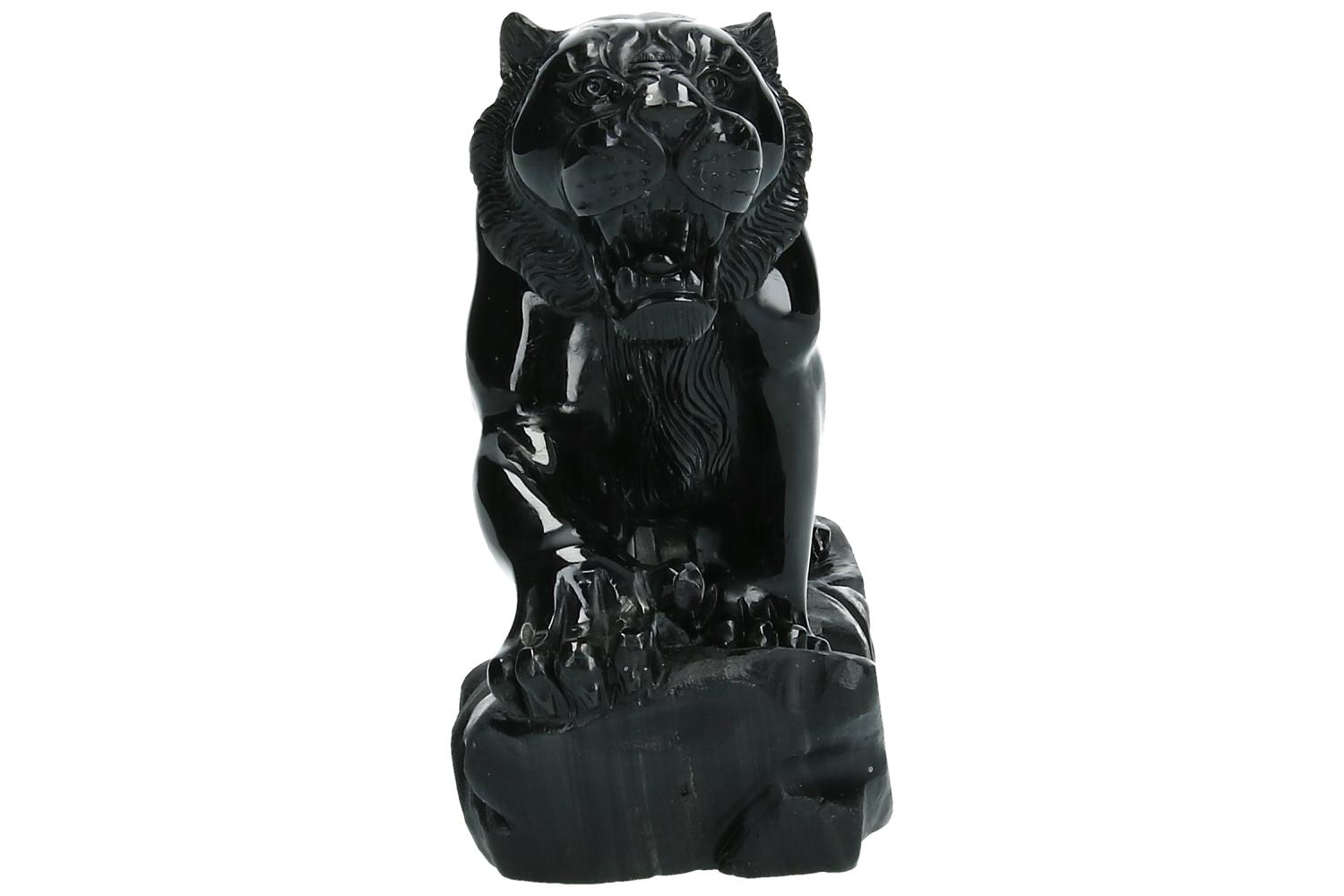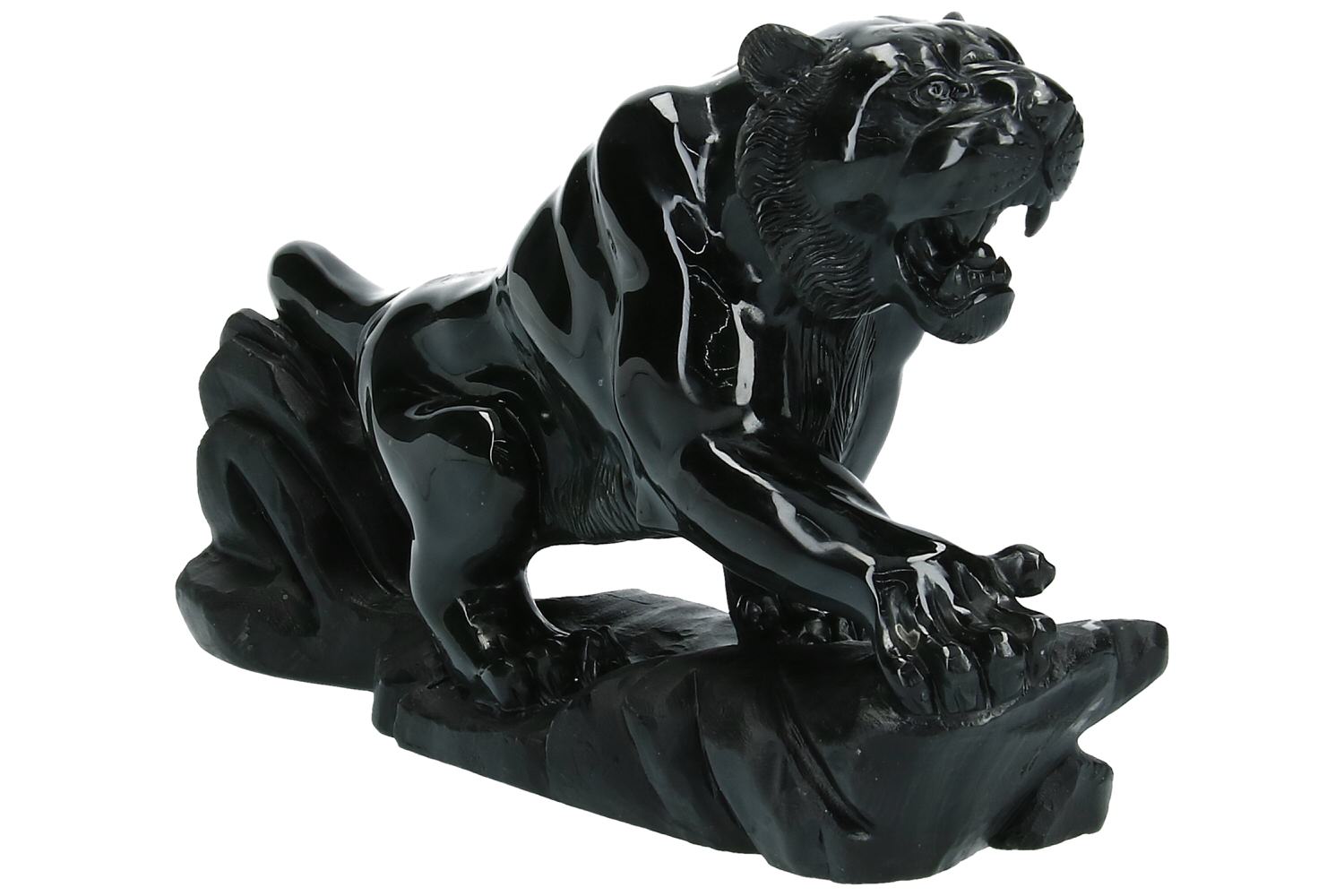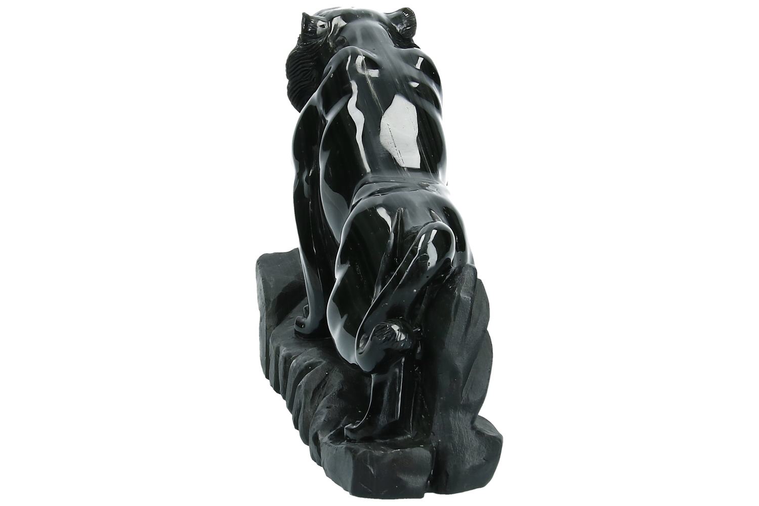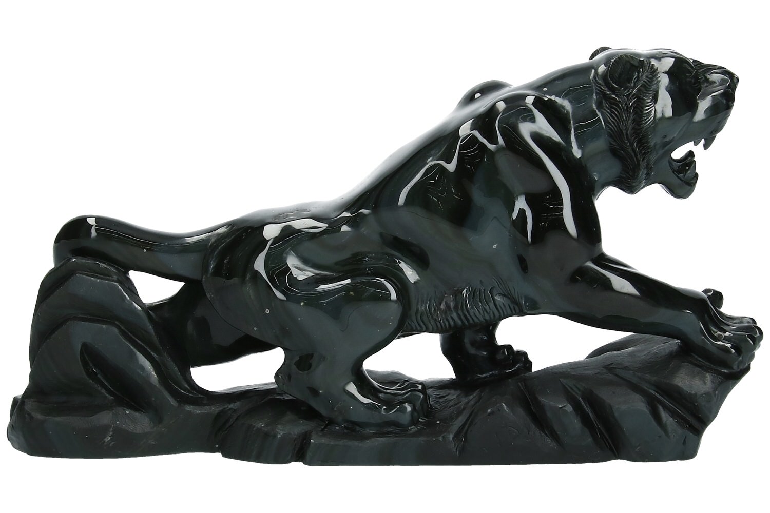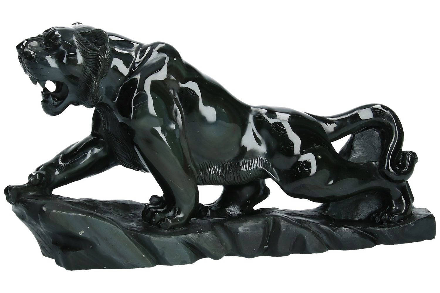 Meisterliche Gravur eines Tigers mit aufgerissenem Maul. Das Raubtier ist aus schwarzem Regenbogen-Obsidian gefertigt. DieserEdelstein zeigt das charakteristische grün-violetten Schimmern im Licht, was auf den Fotos nur schwach zu erkennen ist.. Der lang gestreckte Körper ist poliert, das Muskelspiel ist wunderbar herausgearbeitet. Der Sockel ist mattiert und bietet einen Kontrast zum glänzenden, kraftvollen Körper des beeindruckend dargestellten Raubtiers. Edelsteinschnitzerei in Vollendung!