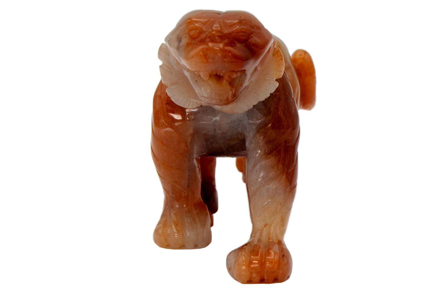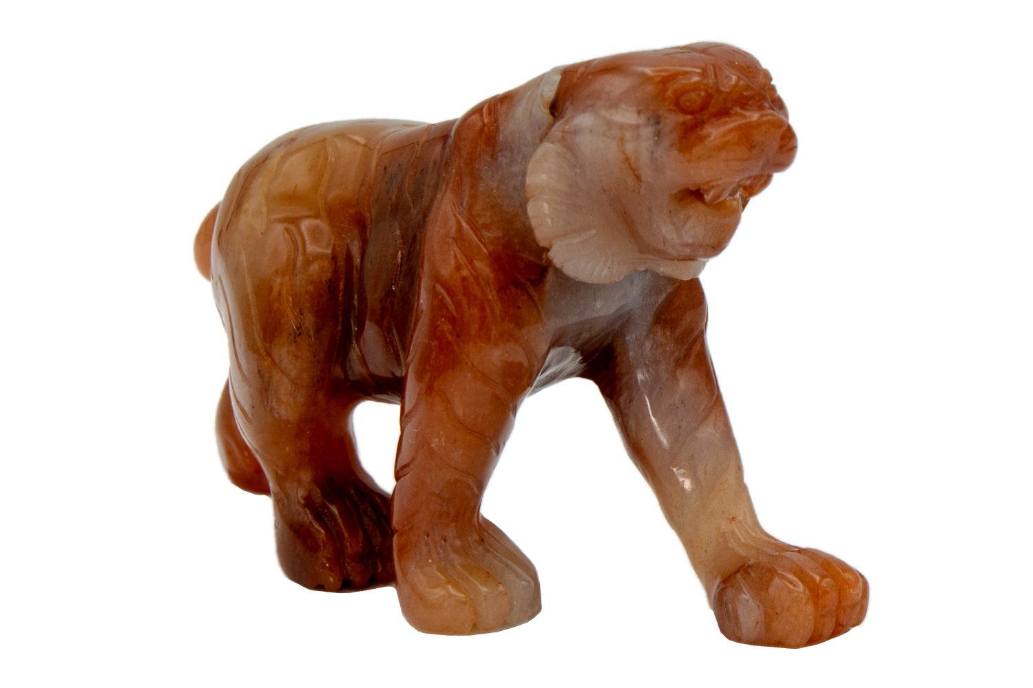 Gravur eines sich anschleichenden Tigers mit geöffnetem Maul. Diese detaillierte Darstellung ist aus orangerotem Aventurin geschnitzt.