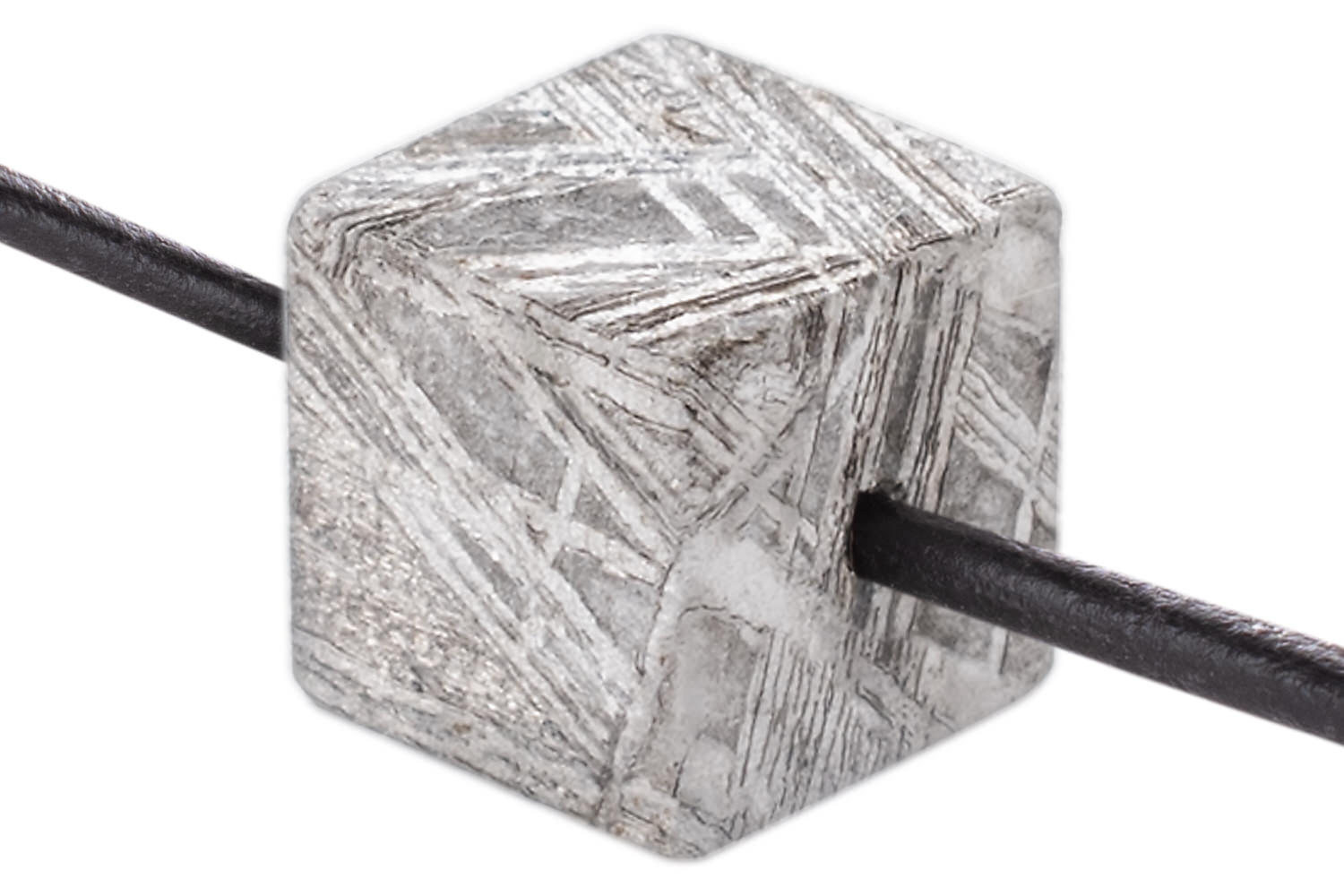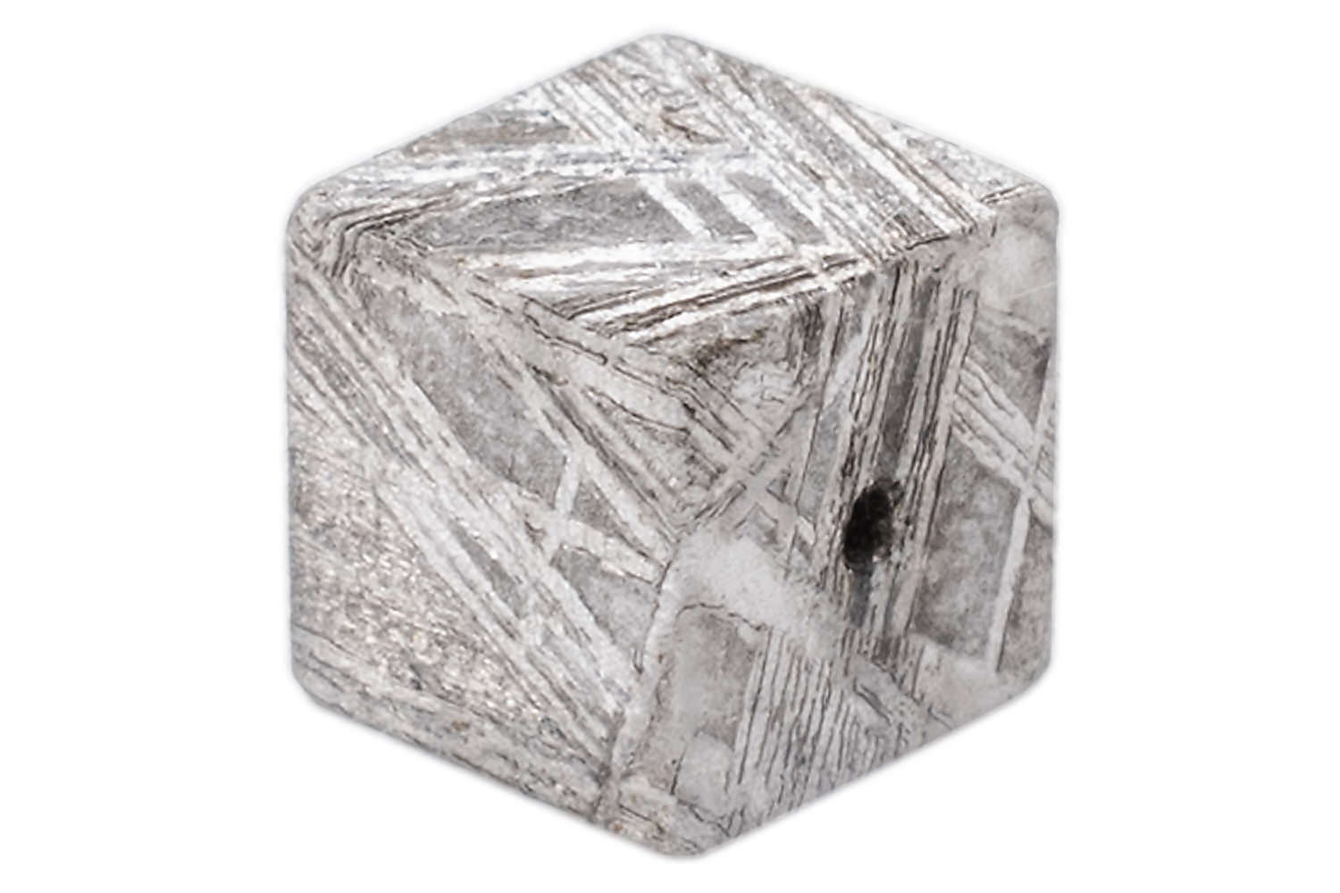 Würfel von 6mm Kantenlänge mit einer mittigen 1mm-Bohrung. Dieser seltene Eisenmeteorit (Muonionalusta) wurde 1906 bei Norbotten in Schweden gefunden. Der Zeitpunkt des Falls wird auf vor 800.000 Jahren geschätzt. Dieser hauptsächlich aus Eisen und Nickel bestehende Meteorit zeigt besonders gut ausgeprägte Widmannstätten´sche Figuren. Um Korrosion vorzubeugen, ist der Würfel komplett rhodiniert. Ein einzigartiges Zeugnis außerirdischen Materials.